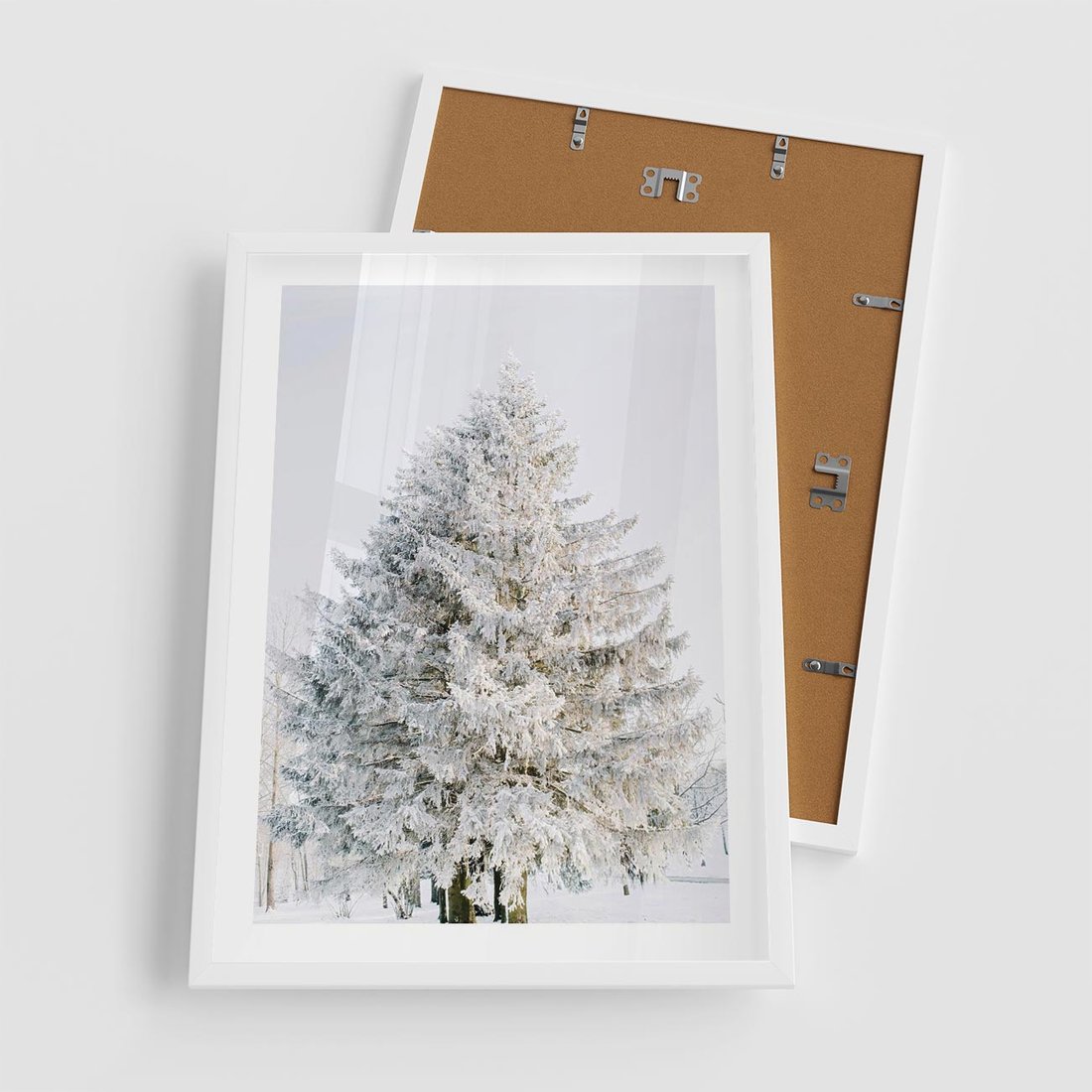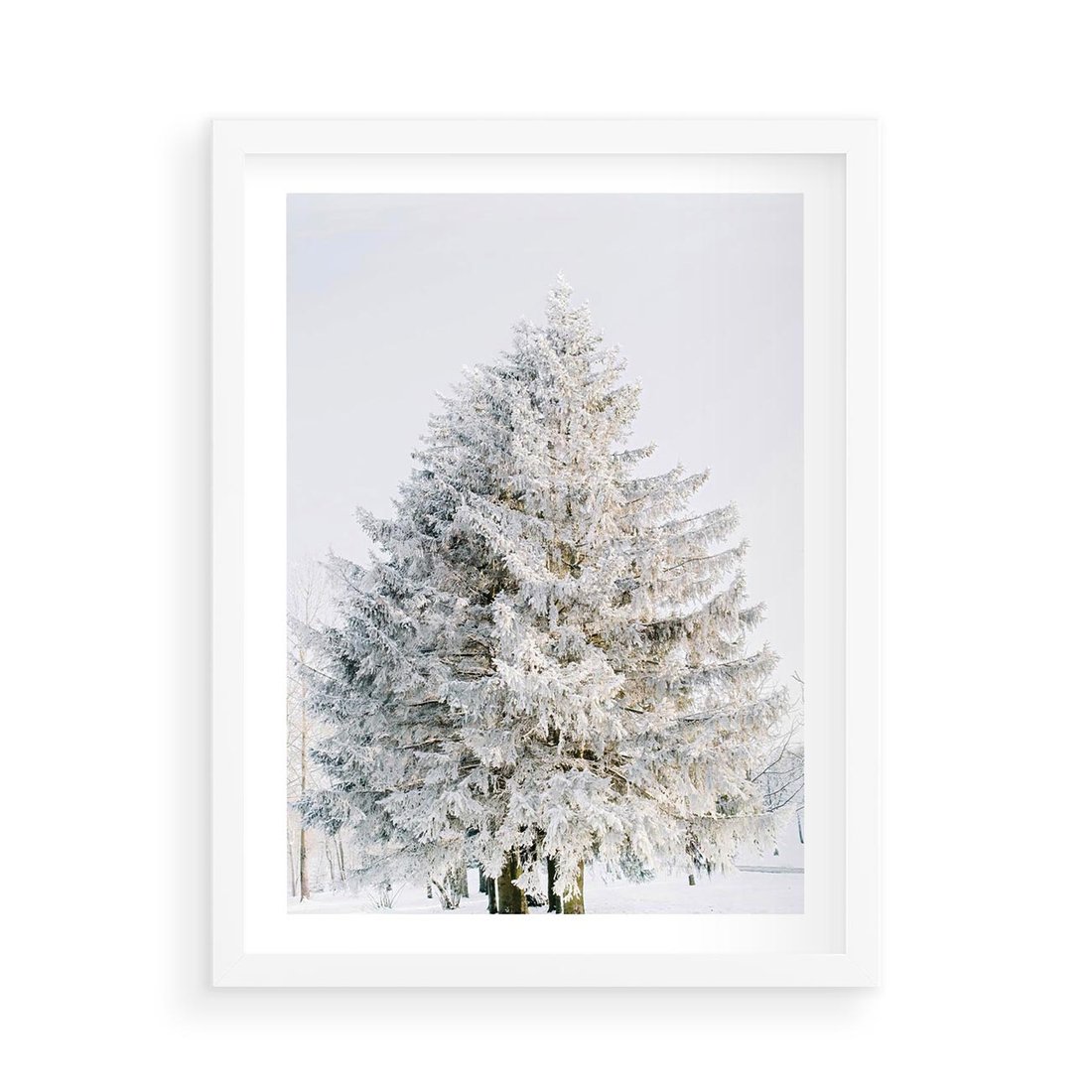 Plakat w ramie 50x70 - Zimowa Poezja w Ośnieżonym Drzewie - ośnieżone drzewo, zima - rama biała
