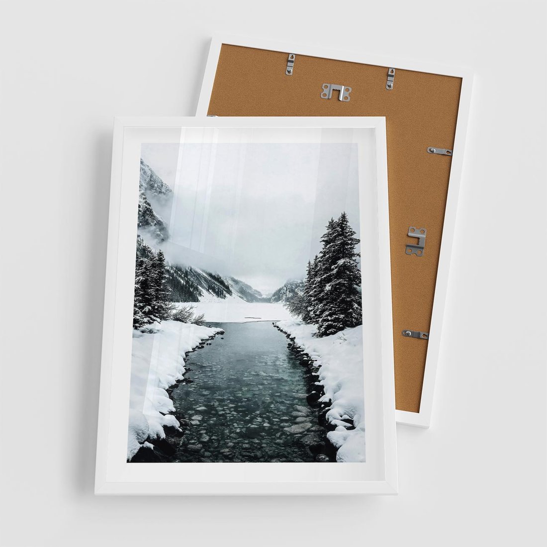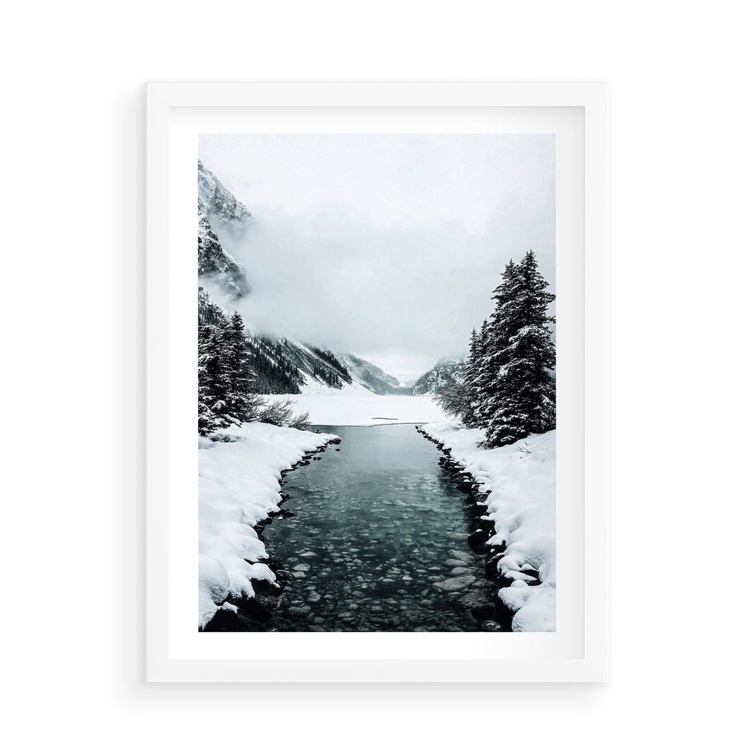 Plakat w ramie 50x70 - Zimowa Przyroda: Rzeka, Góry i Śnieg - zima, rzeka - rama biała