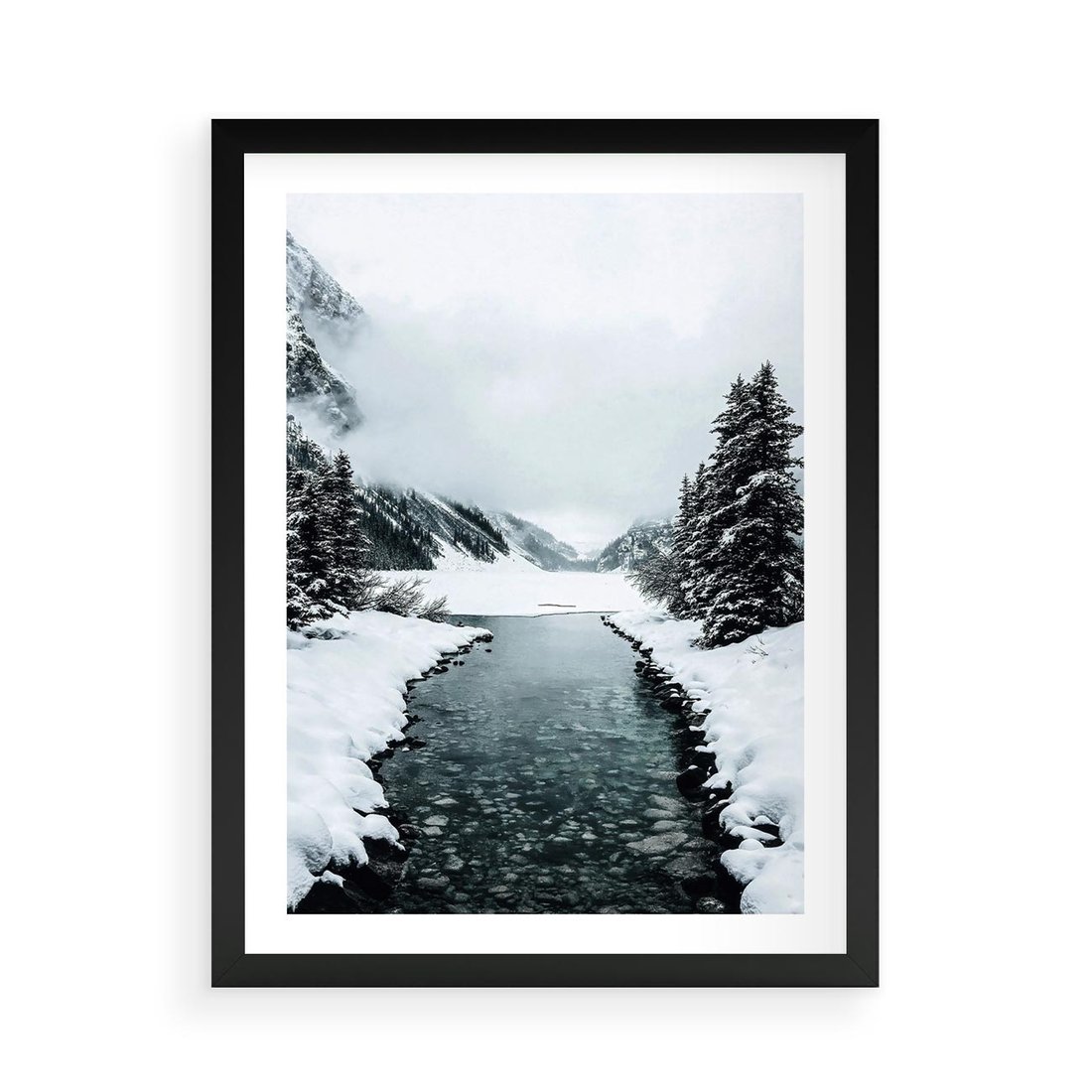 Plakat w ramie 50x70 - Zimowa Przyroda: Rzeka, Góry i Śnieg - zima, rzeka - rama czarna