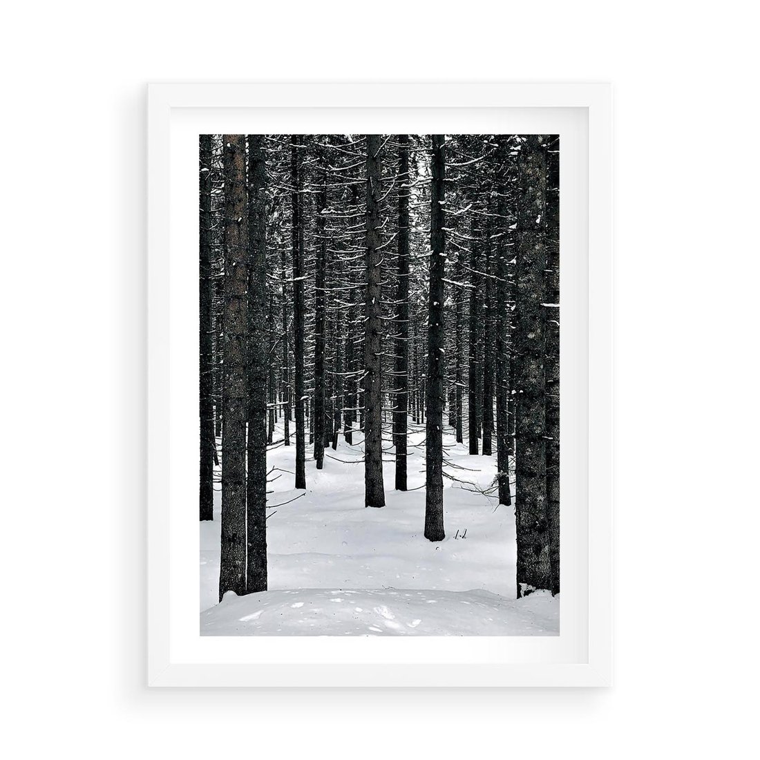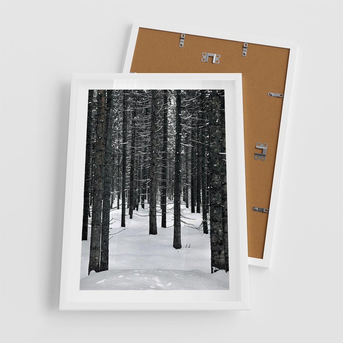 Plakat w ramie 50x70 - Zimowe Drzewa: Śnieg na Pniach - drzew w zimi, pnie drzew - rama biała