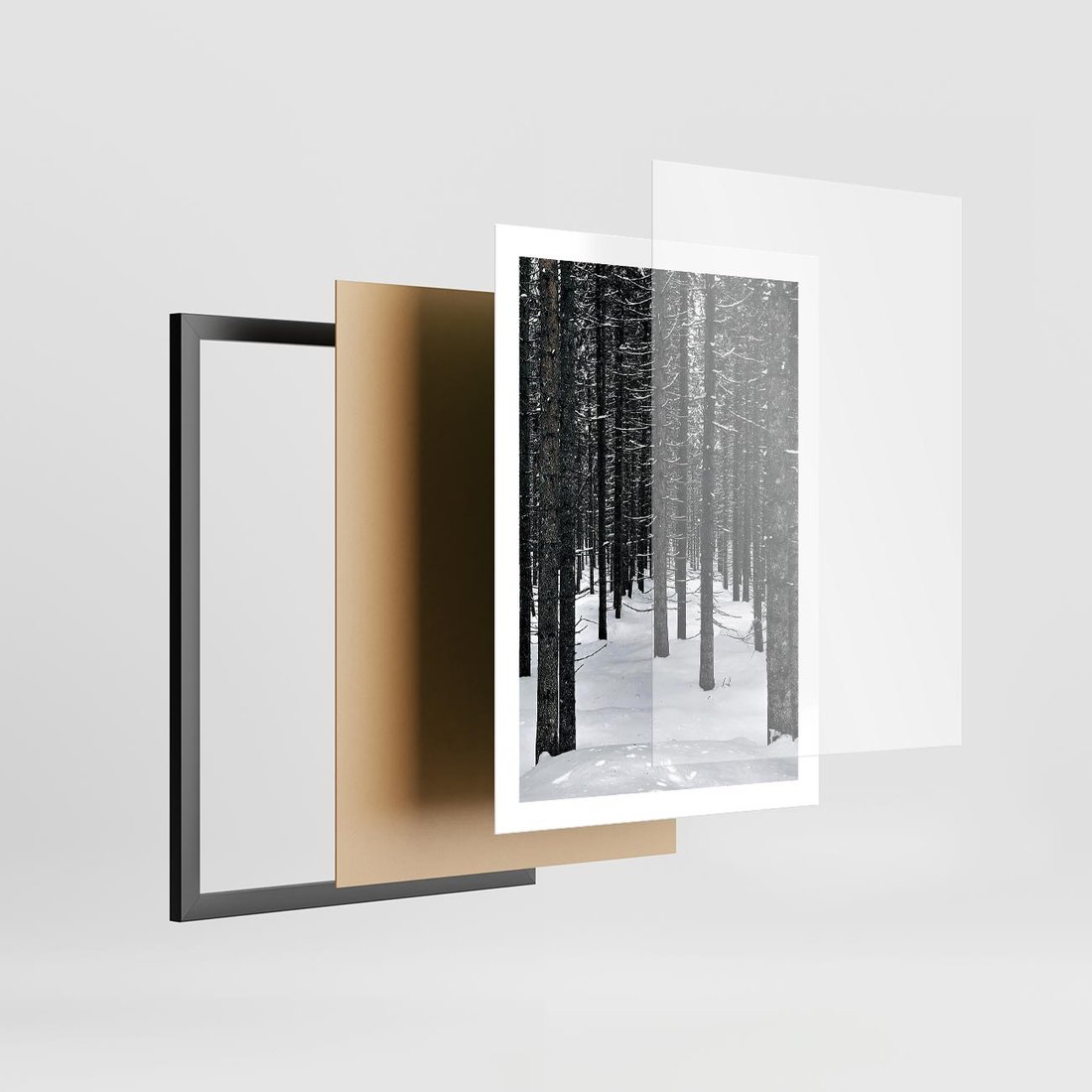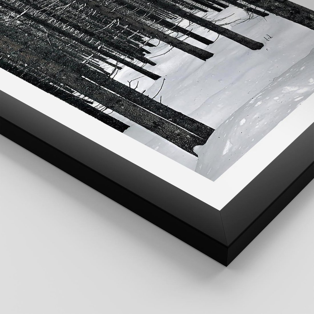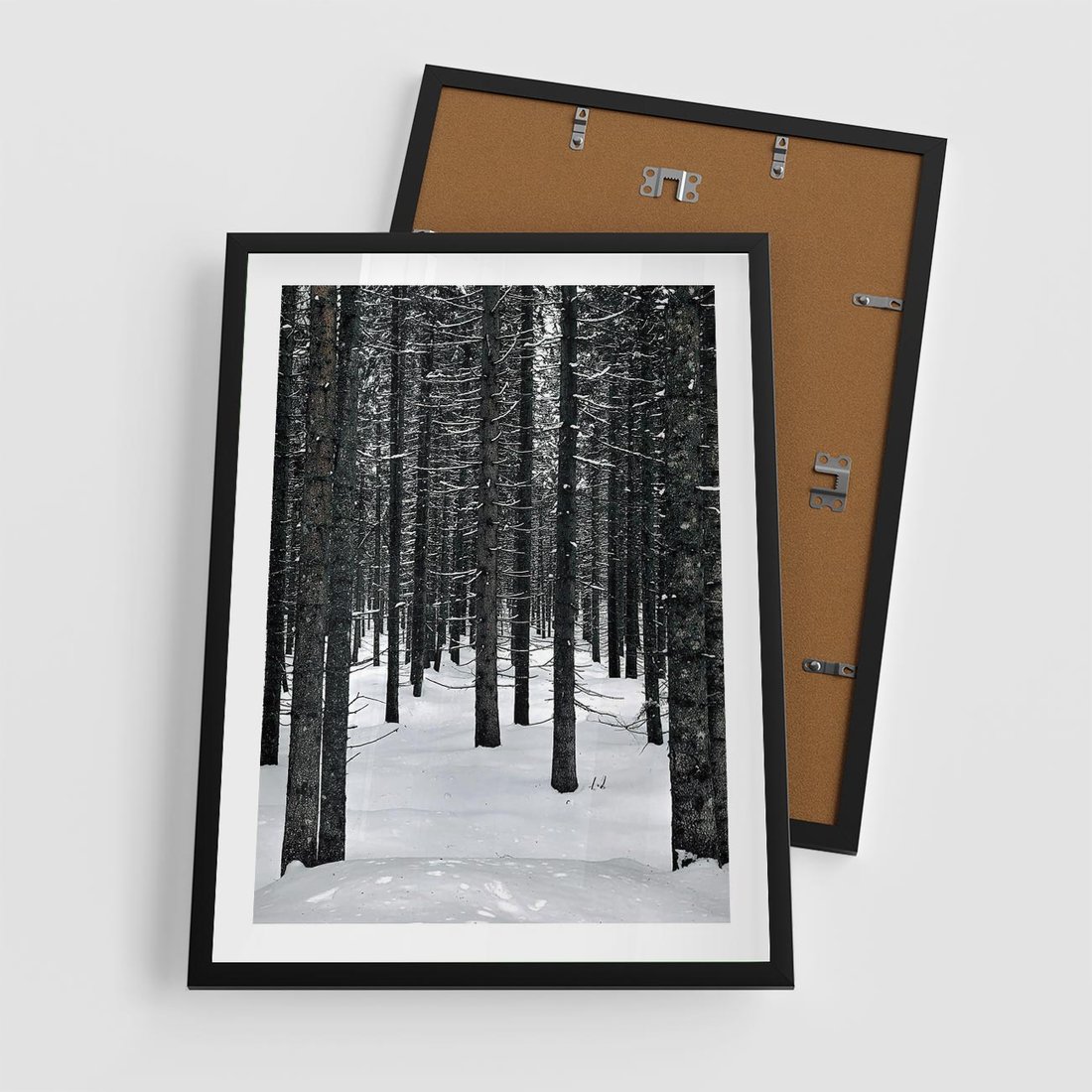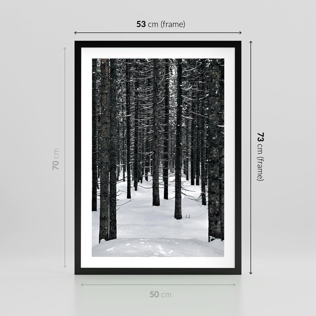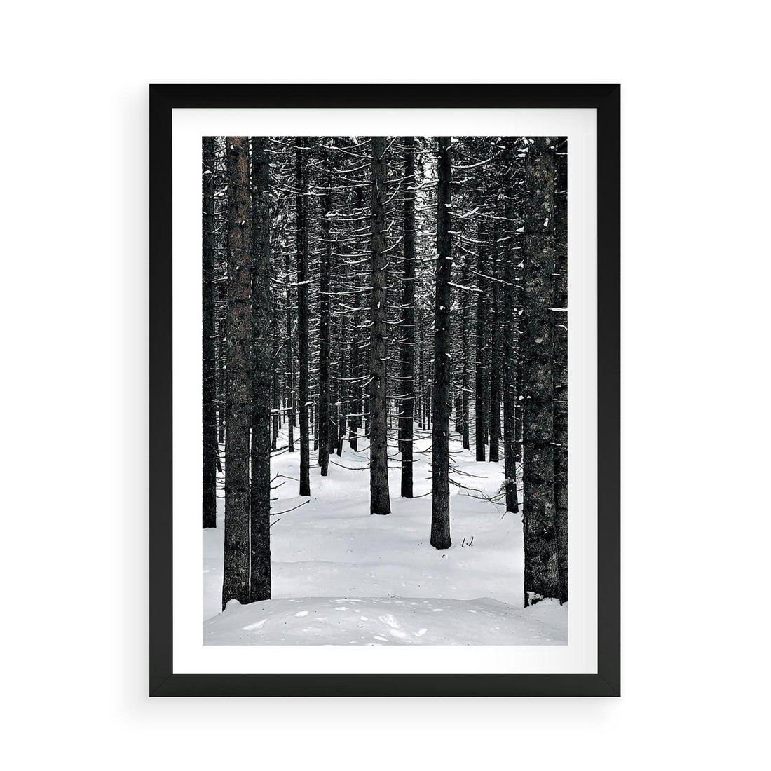Plakat w ramie 50x70 - Zimowe Drzewa: Śnieg na Pniach - drzew w zimi, pnie drzew - rama czarna