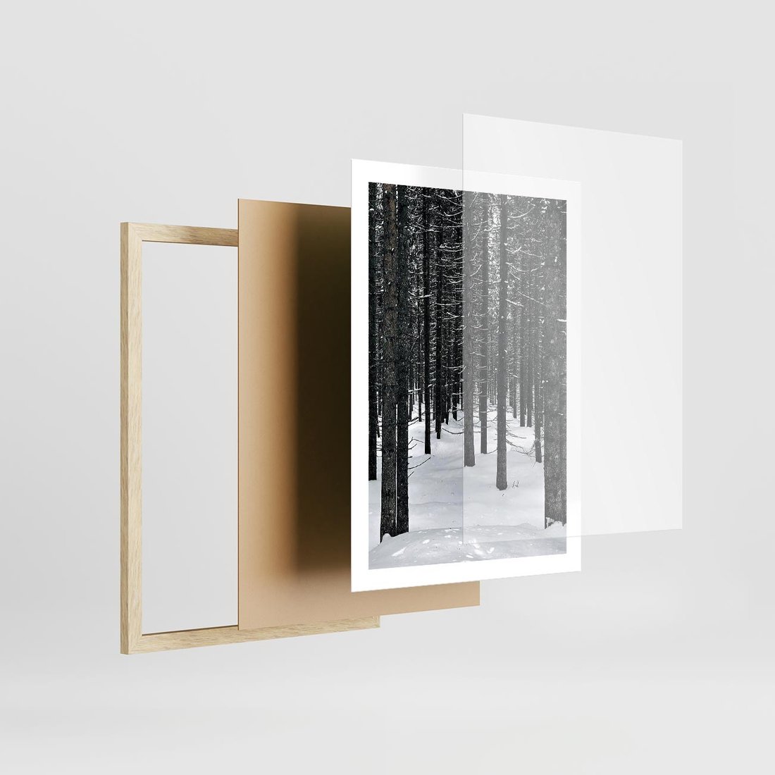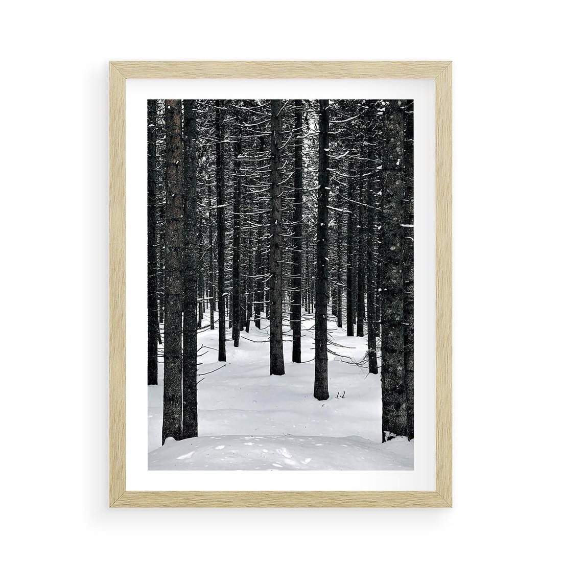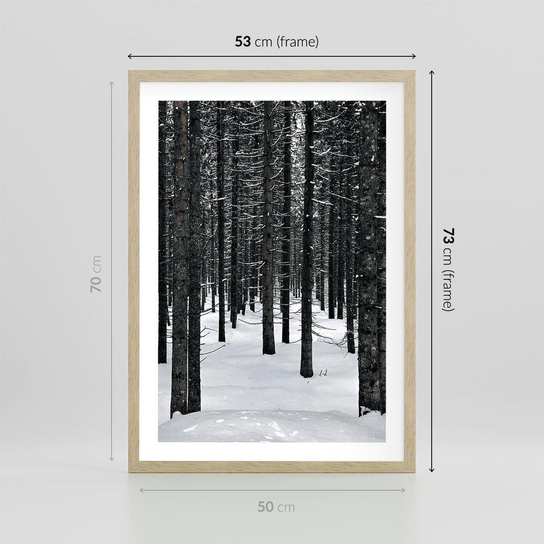 Plakat w ramie 50x70 - Zimowe Drzewa: Śnieg na Pniach - drzew w zimi, pnie drzew - rama drewno