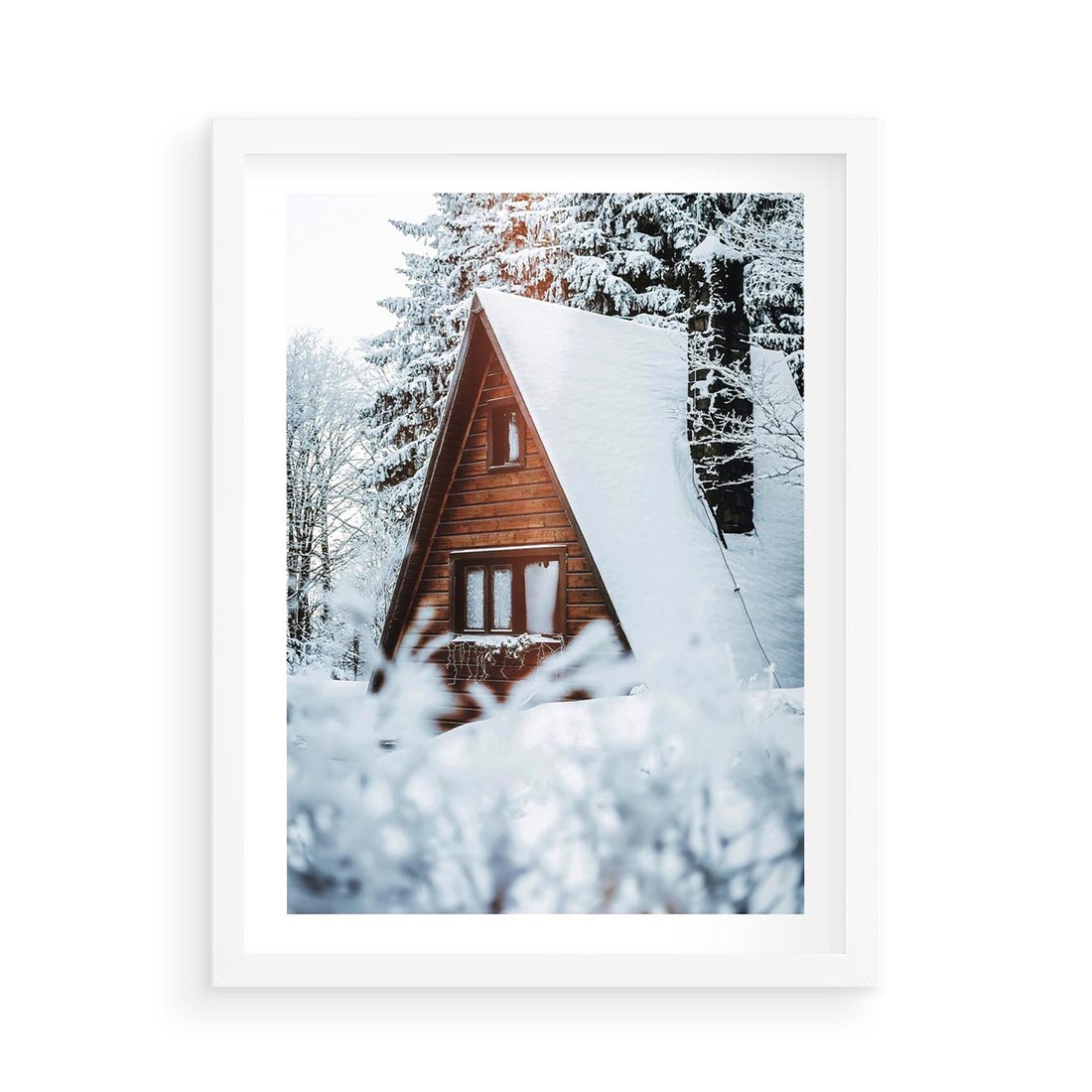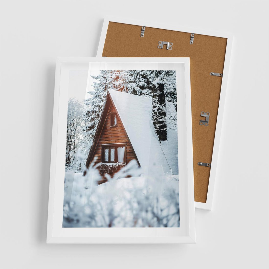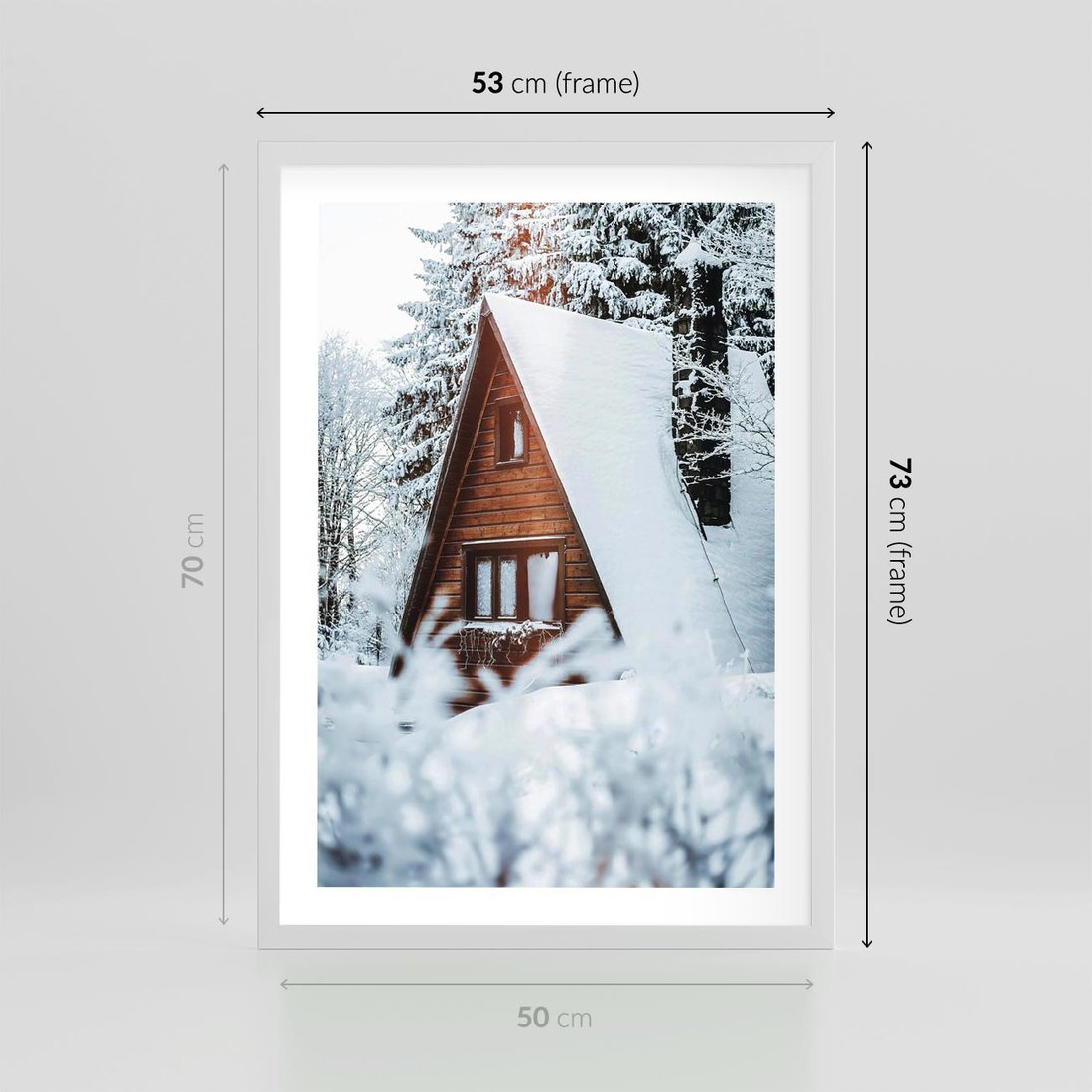 Plakat w ramie 50x70 - Zimowe Ustronie w Lesie - domek w lesie, zimowy las - rama biała