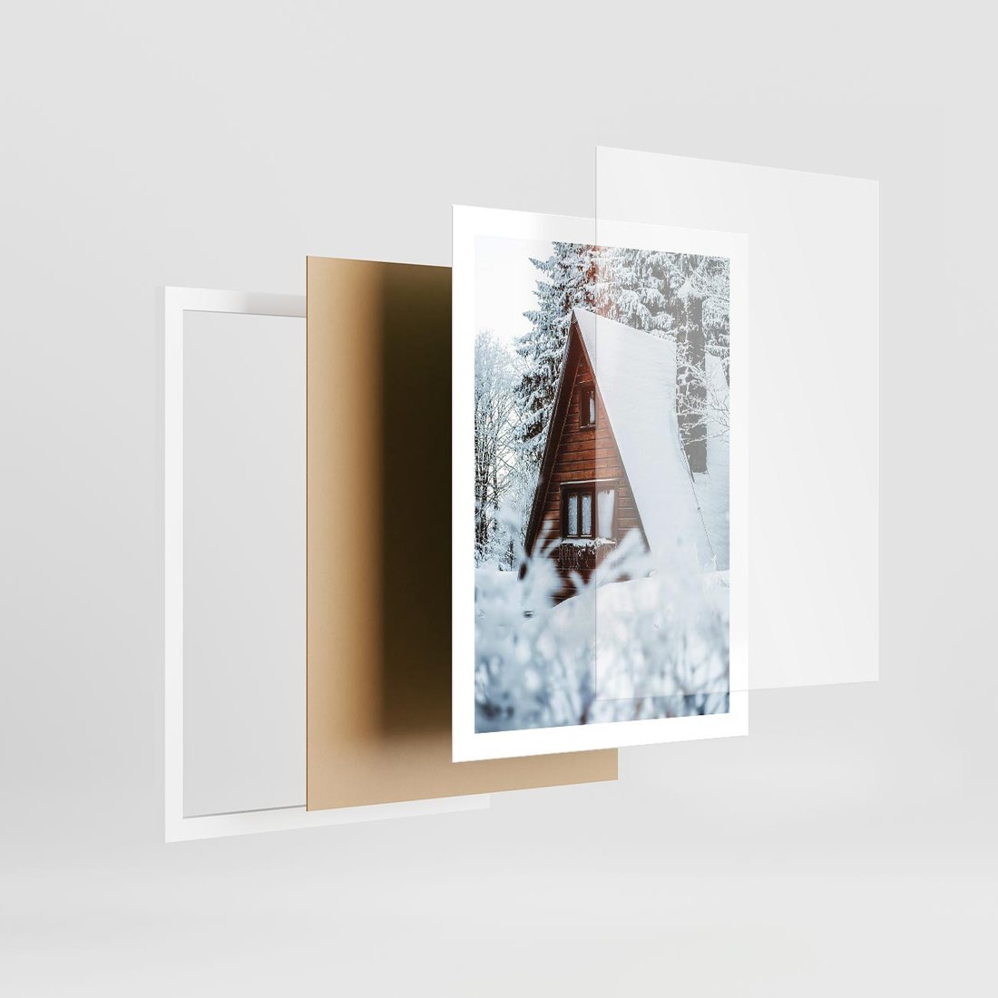 To ujęcie uroczego domku położonego w malowniczym zimowym lesie, gdzie dach budynku jest pokryty śniegiem. Obraz emanuje urokiem zimowego krajobrazu i spokoju. Doskonale pasuje do wnętrz o tematyce zimowej, skandynawskiej lub wiejskiej, nadając im urok i przytulność.