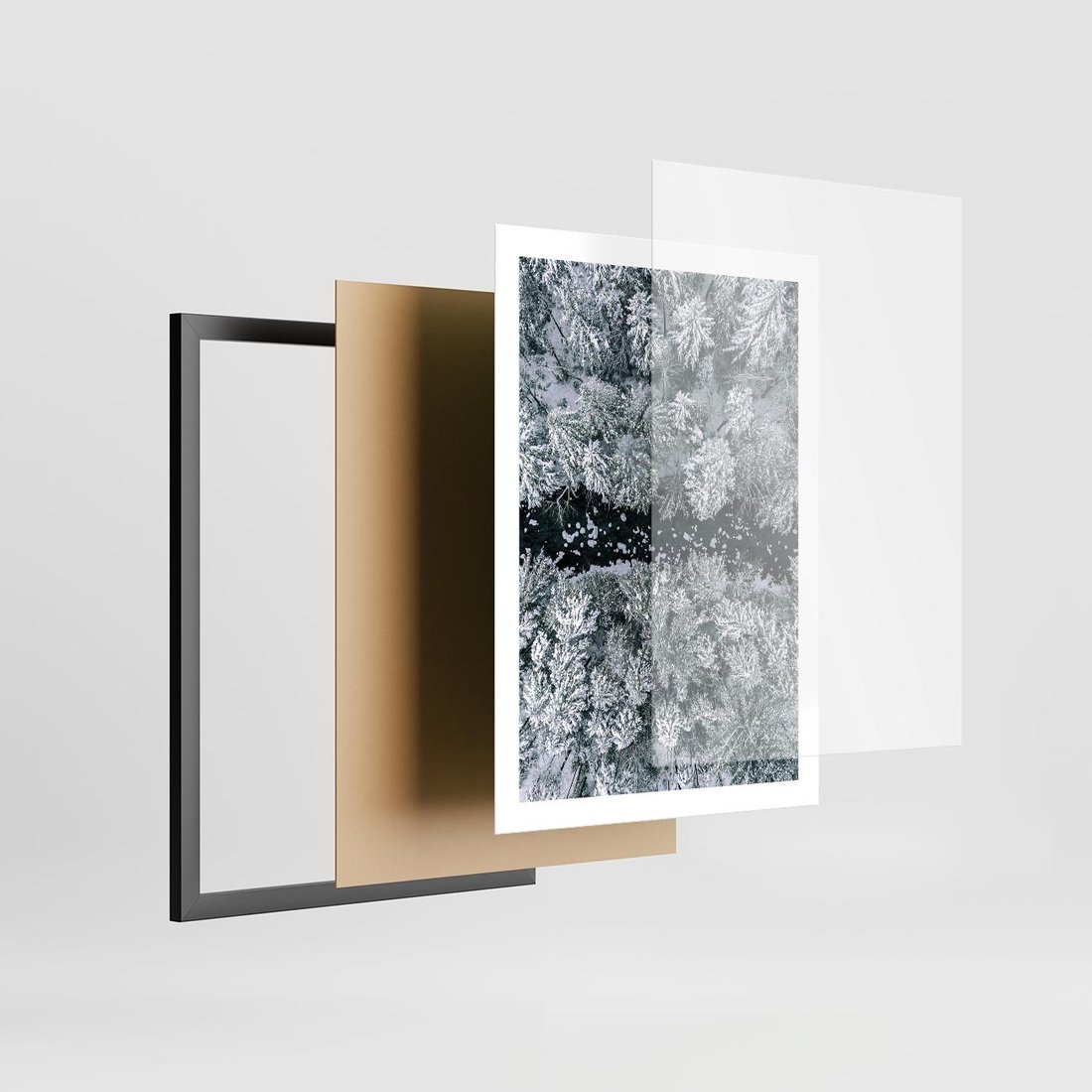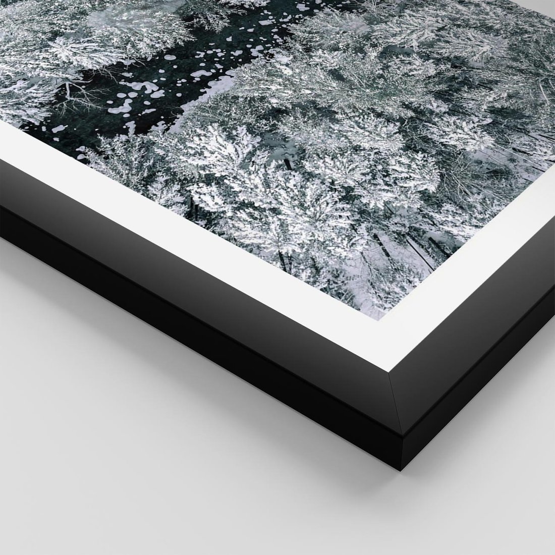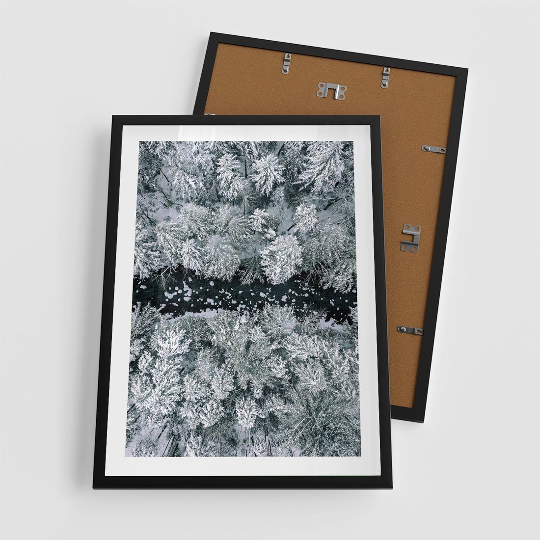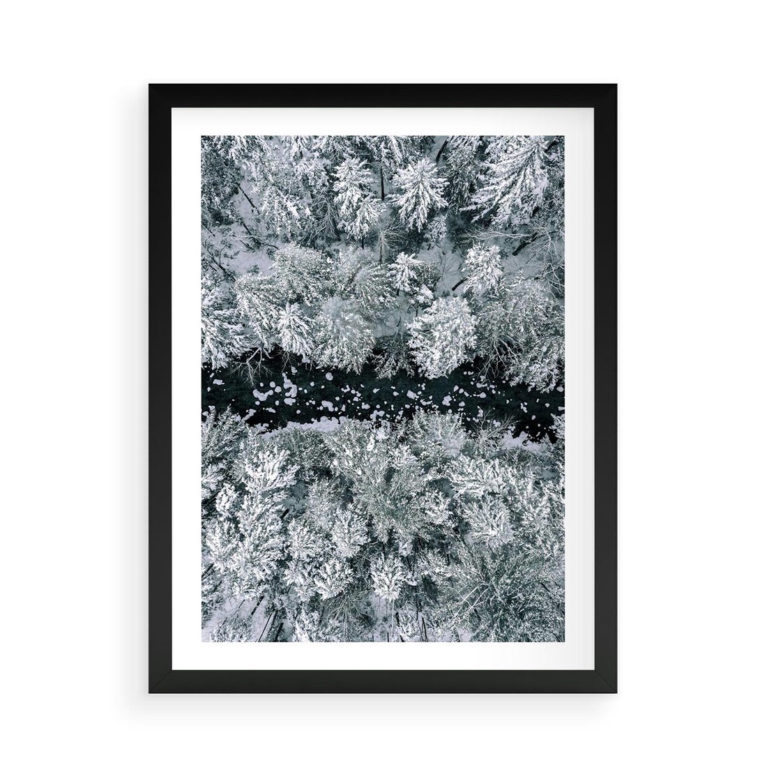 Plakat w ramie 50x70 - Zimowy Krajobraz z Góry - zdjęcie z góry, zaśnieżony las i zamarznięty strumyk - rama czarna