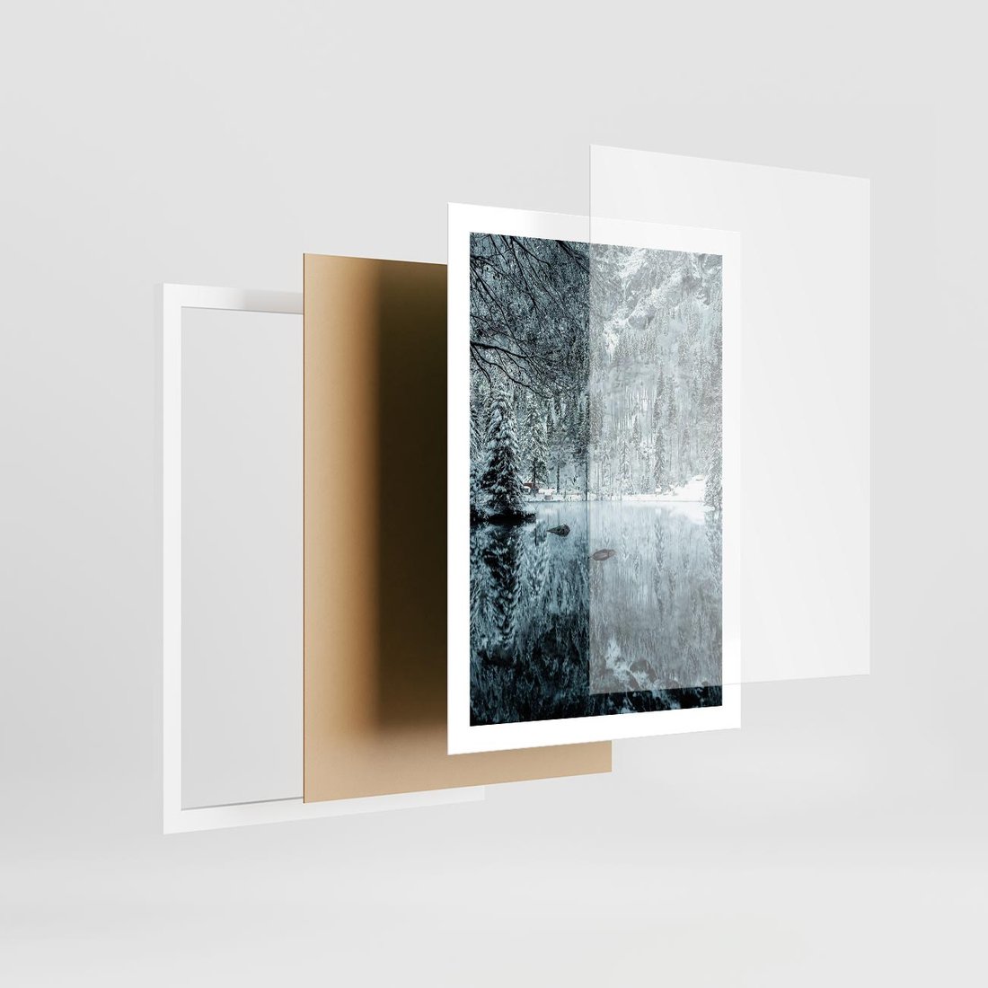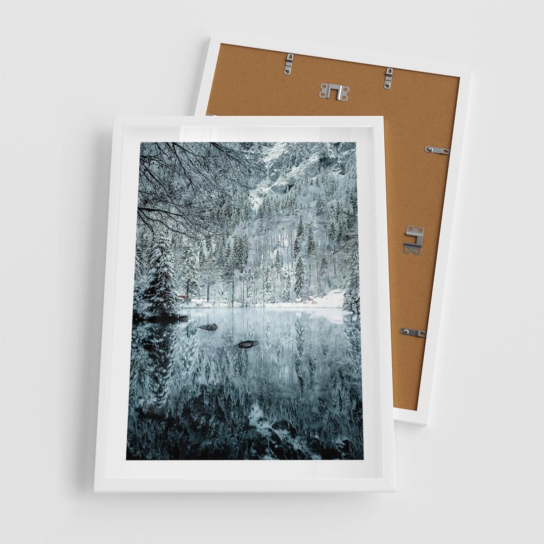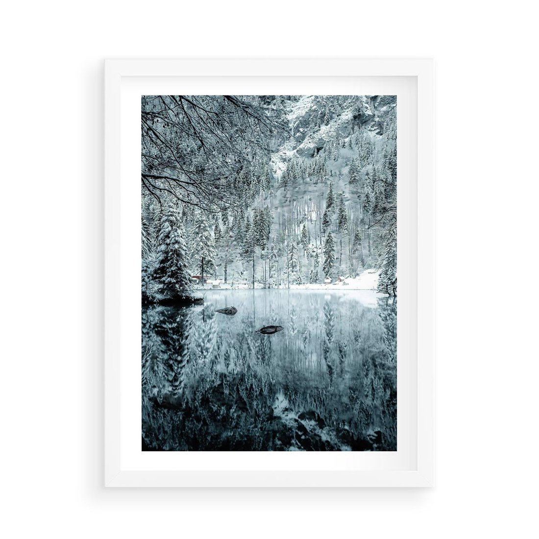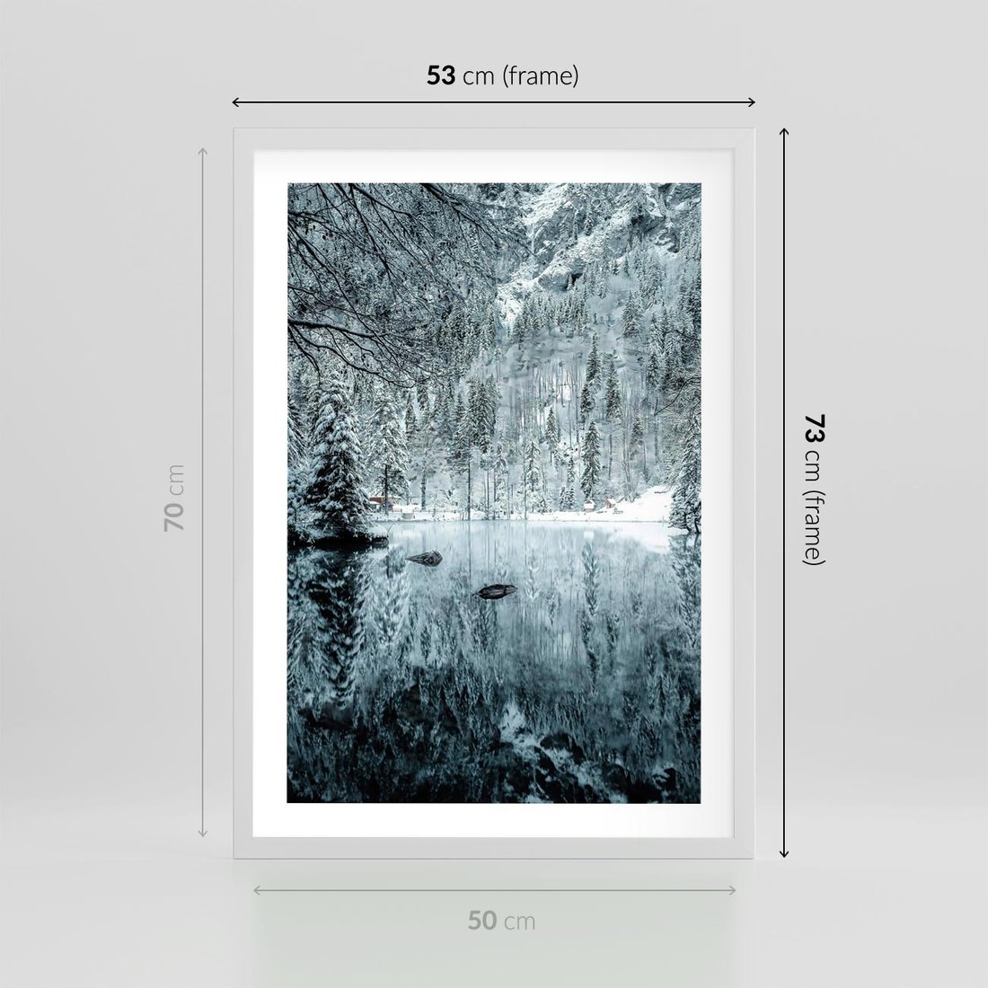 Plakat w ramie 50x70 - Zimowy Raj - zimowy górski krajobraz, jezioro w górach - rama biała
