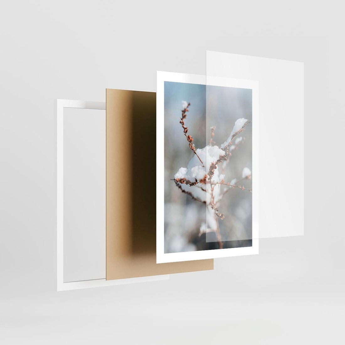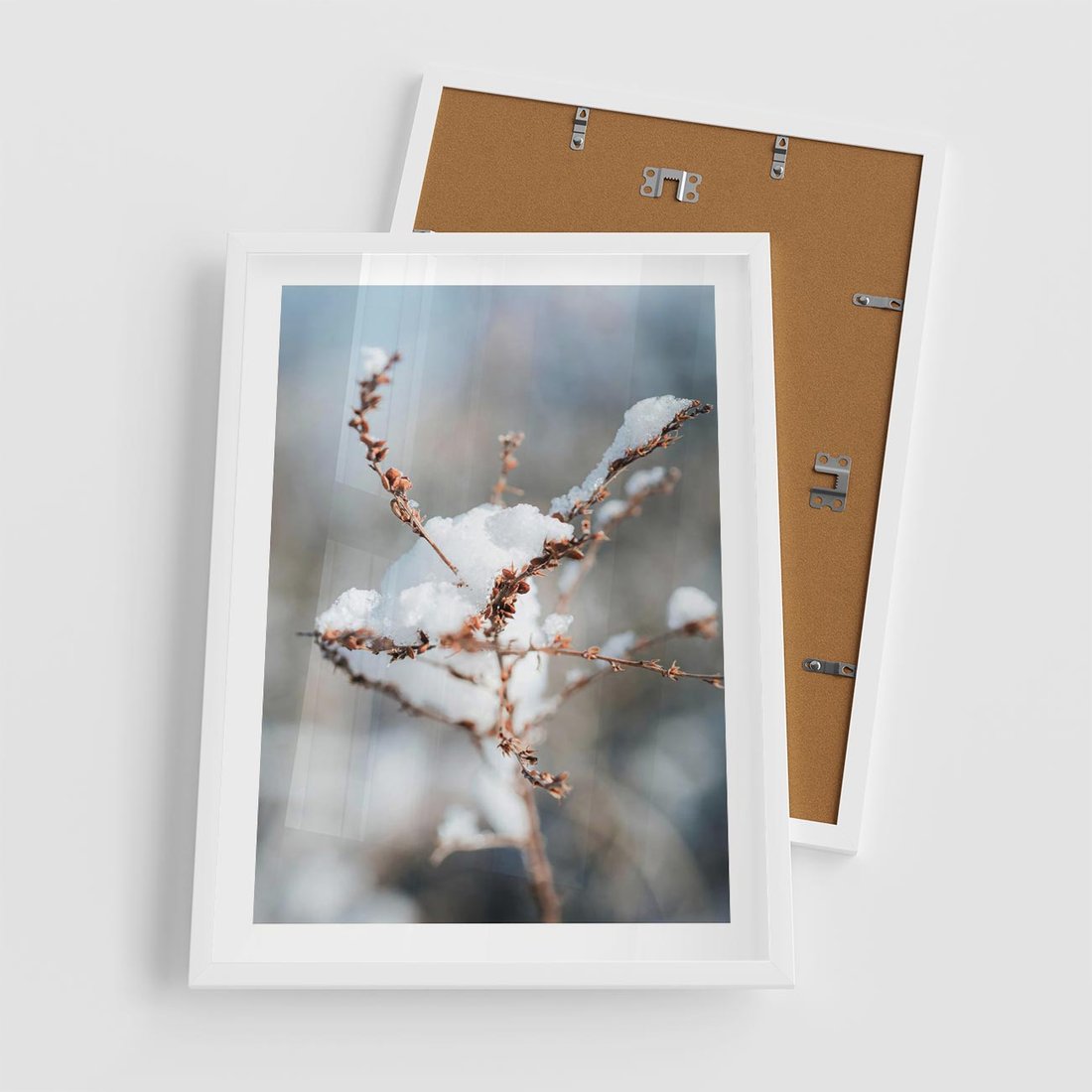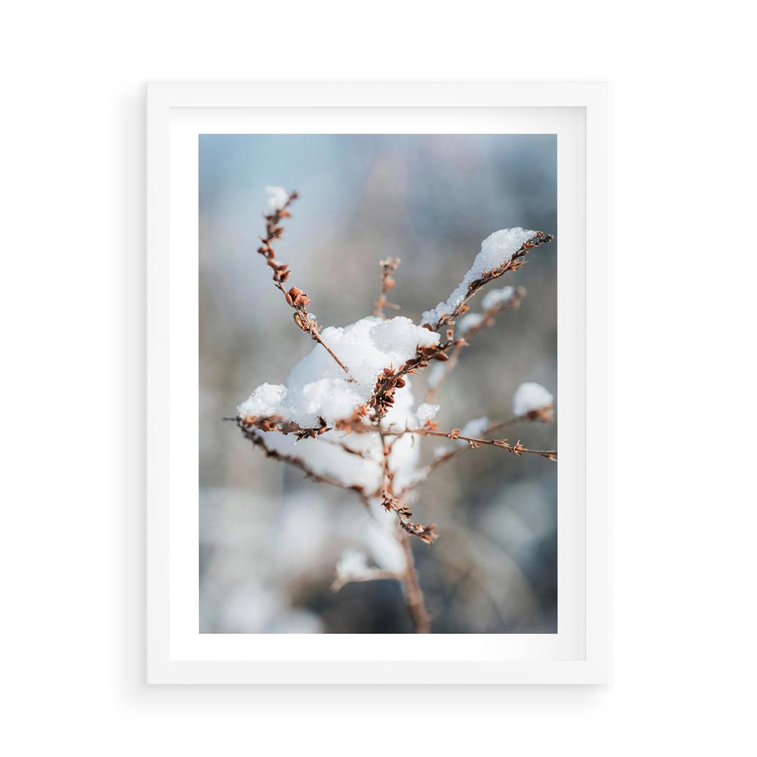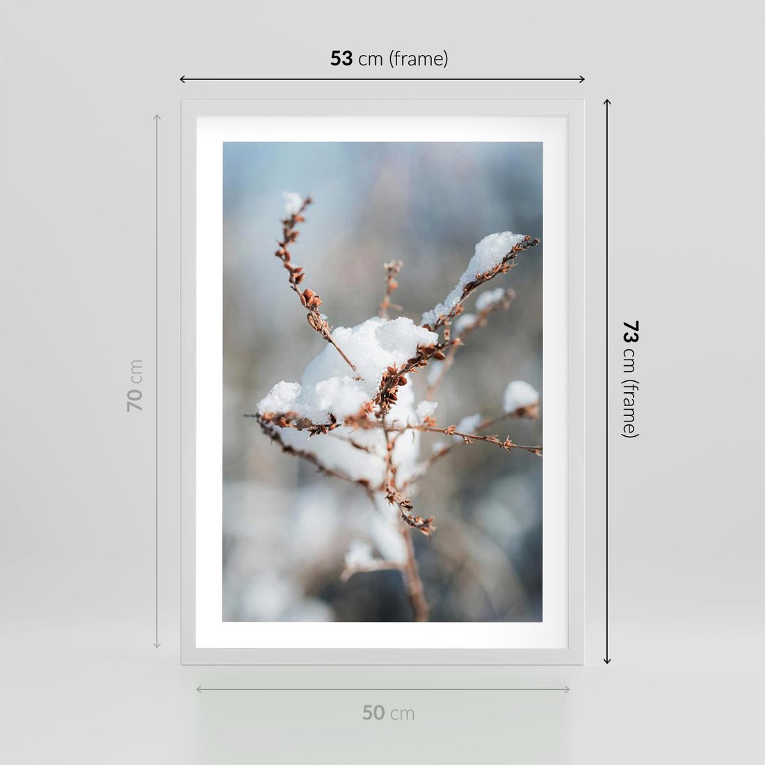Plakat w ramie 50x70 - Zimowy Urok Natury - gałązki pod śniegiem, natura - rama biała