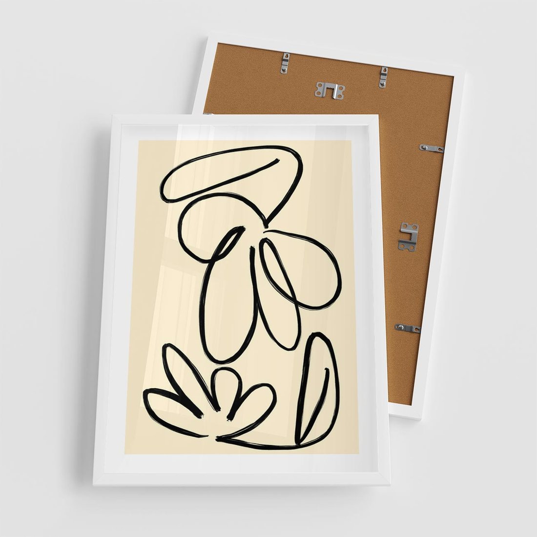 Nasza abstrakcyjna sztuka to delikatna kompozycja przypominająca kształtem kwiat. Wszystko to utrzymane jest w kontrastujących czerń i biel. To minimalizm w swojej najczystszej formie, gdzie subtelne linie tworzą elegancką i spokojną wizję, oddając hołd prostocie i pięknu.