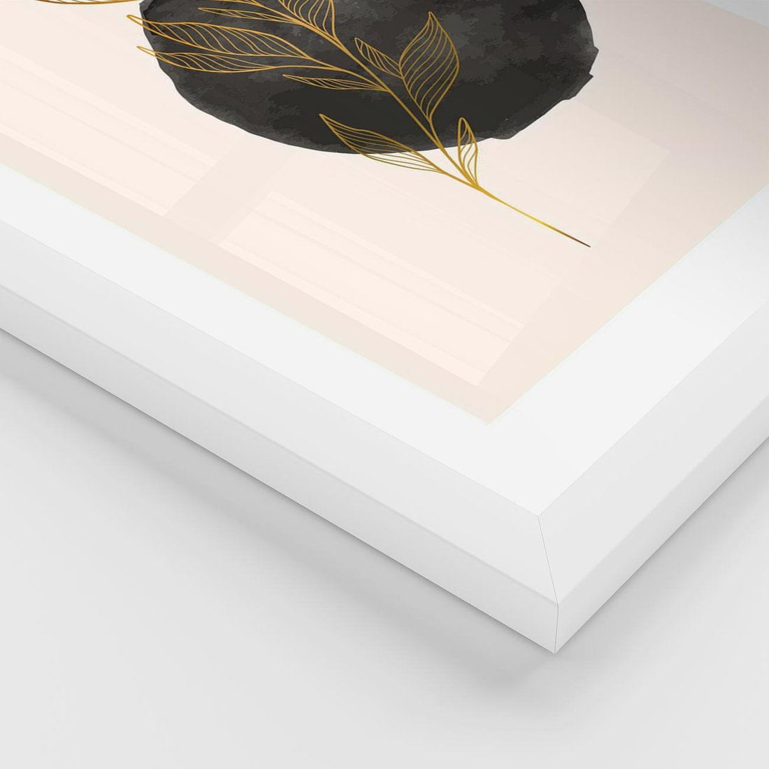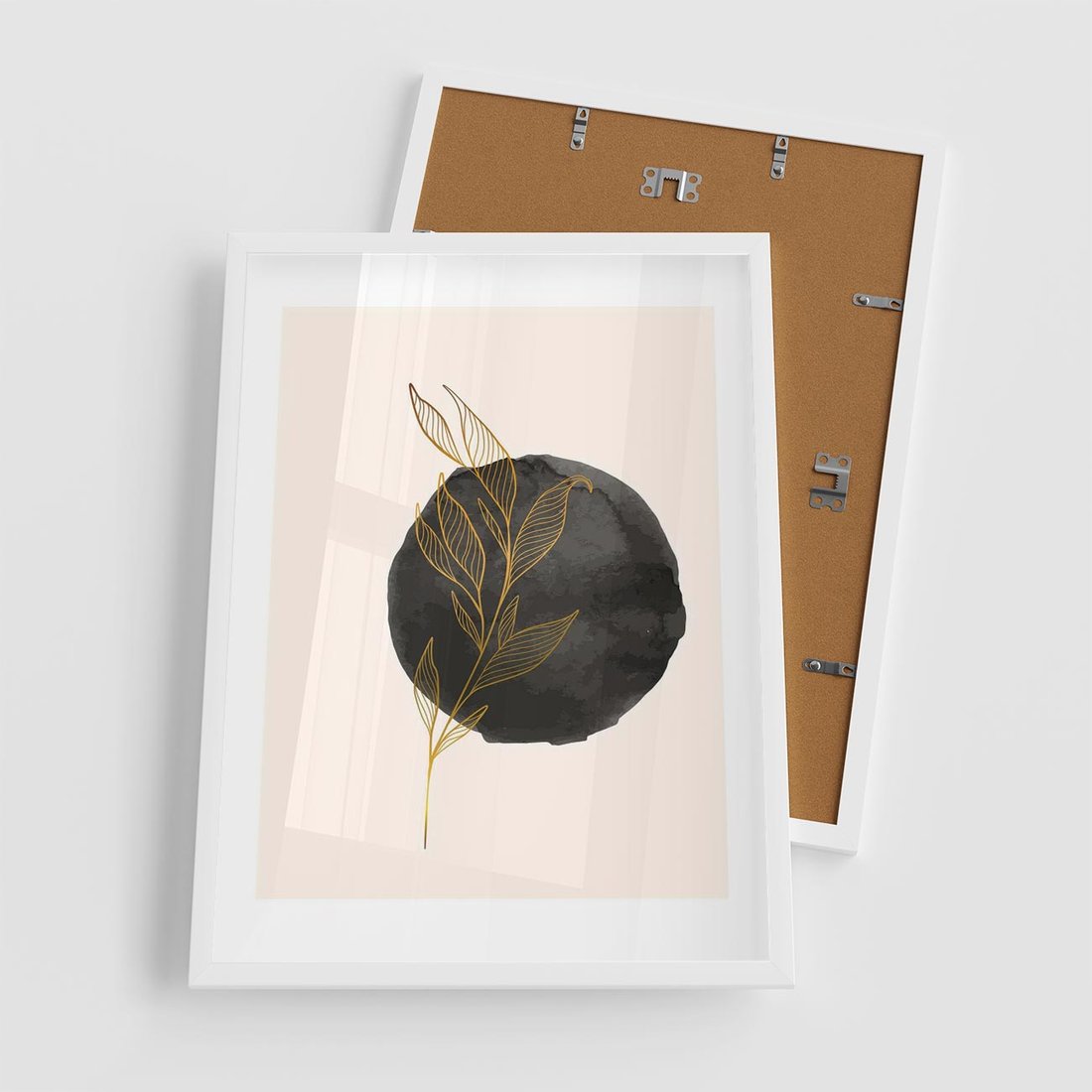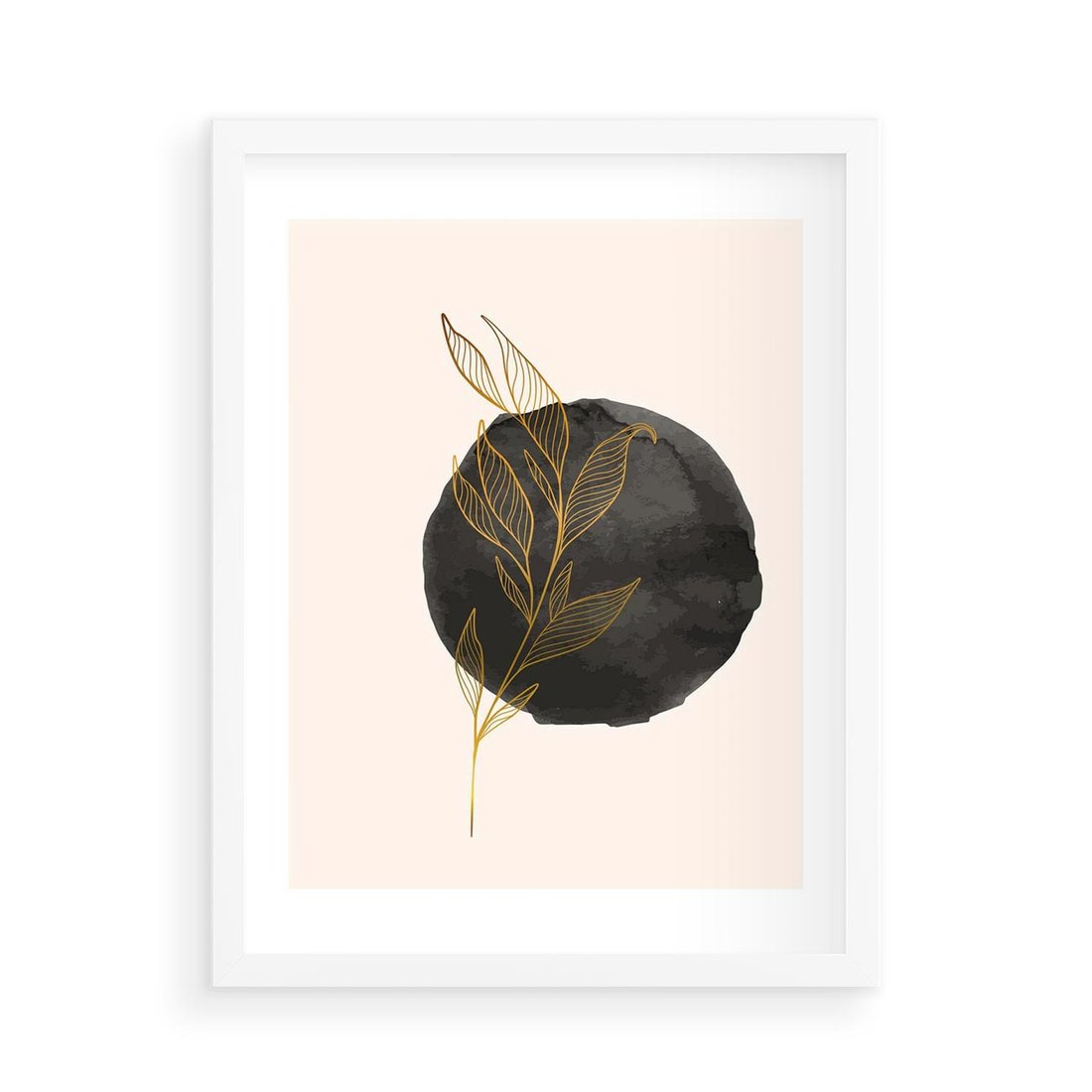 Plakat w ramie 50x70 - Złota Gałązka na Tle Akwarelowej Ciemności - złota gałązka, czarna plama akwarelowa w tle - rama biała