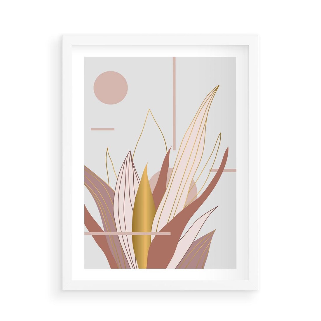 Plakat w ramie 50x70 - Złota Grafika Liści: Wyjątkowa Dekoracja - liście, złoto - rama biała
