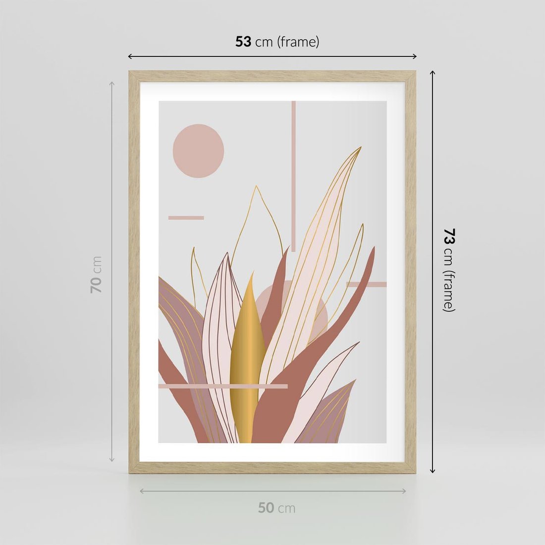 Plakat w ramie 50x70 - Złota Grafika Liści: Wyjątkowa Dekoracja - liście, złoto - rama drewno
