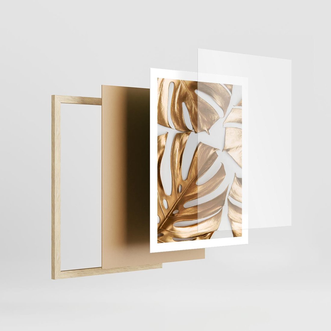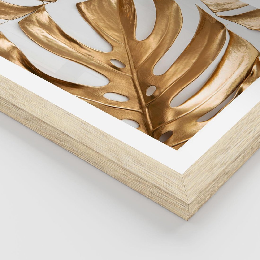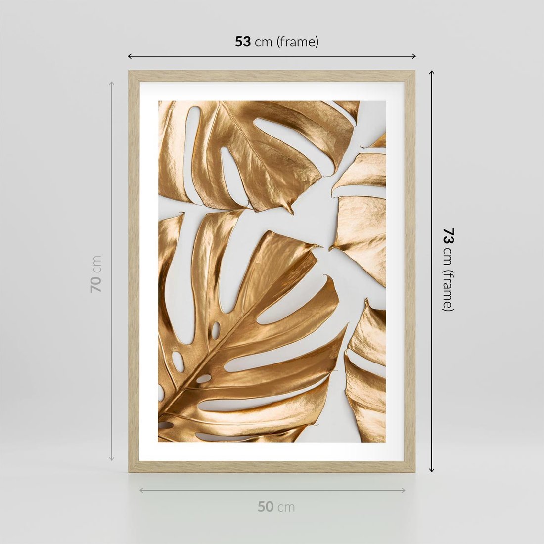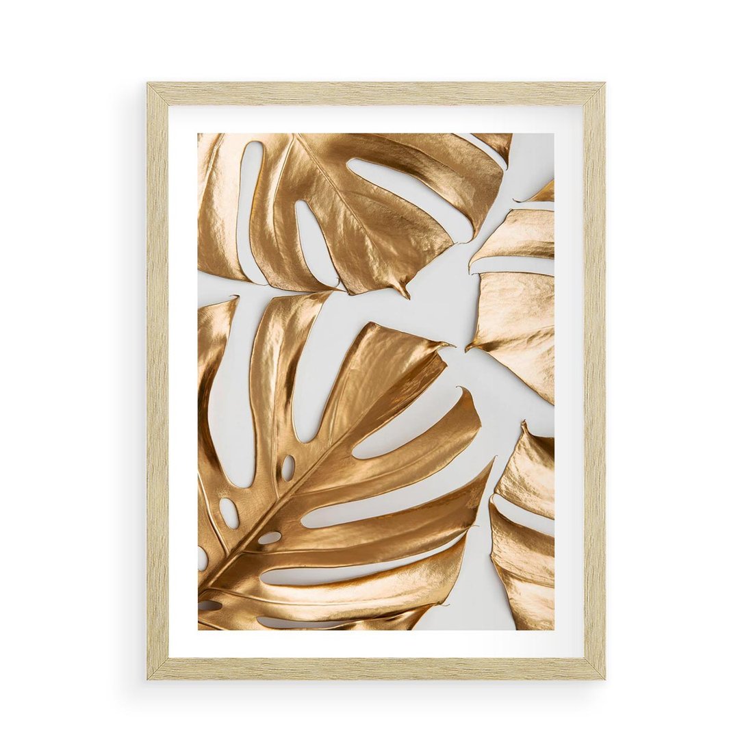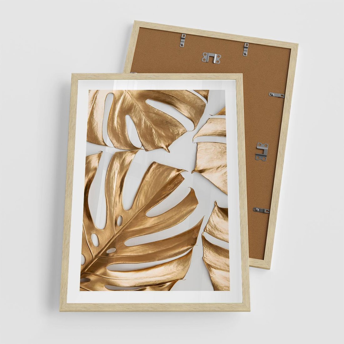 Plakat w ramie 50x70 - Złote Akcenty w Fotografii - złotel liście monstery, na białym tle - rama drewno