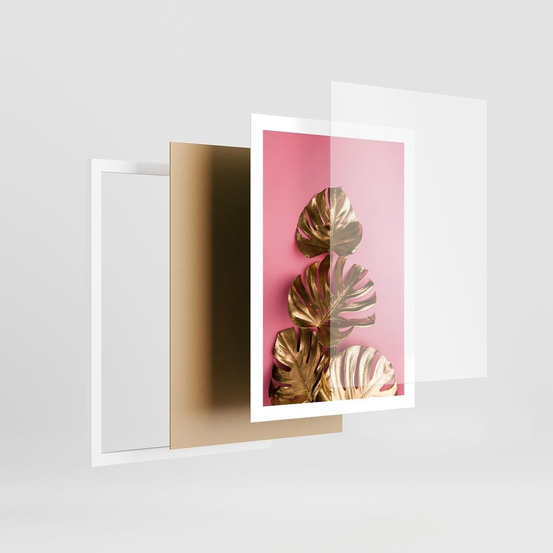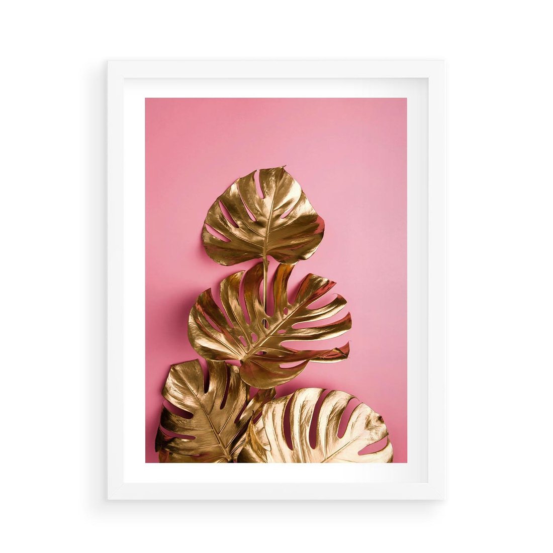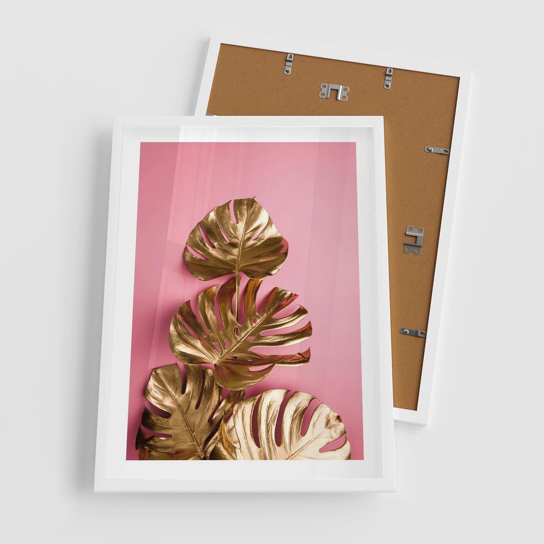 Plakat w ramie 50x70 - Złote Liście Monstery: Delikatność na Różowym Tle - złote liście monstery, różowe tło - rama biała