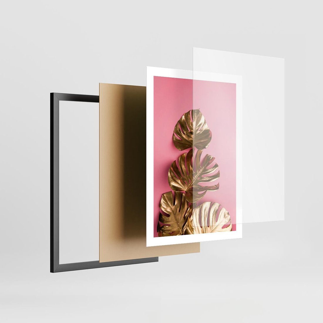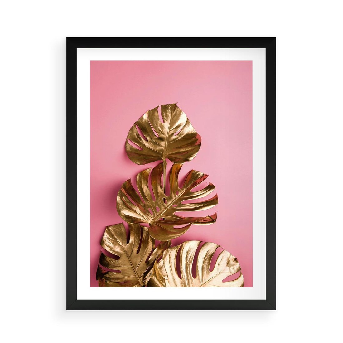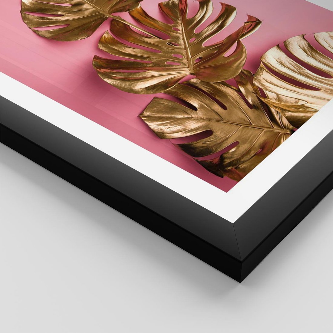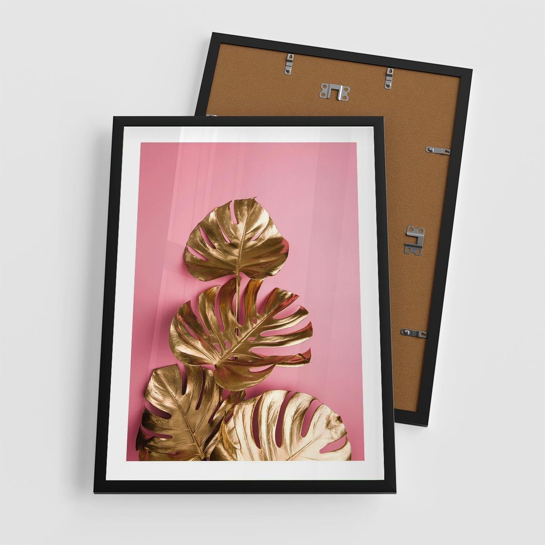 Plakat w ramie 50x70 - Złote Liście Monstery: Delikatność na Różowym Tle - złote liście monstery, różowe tło - rama czarna