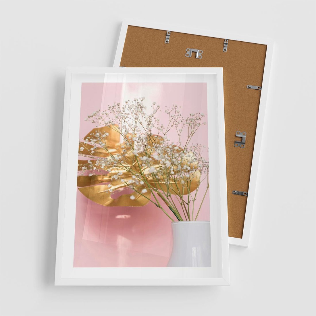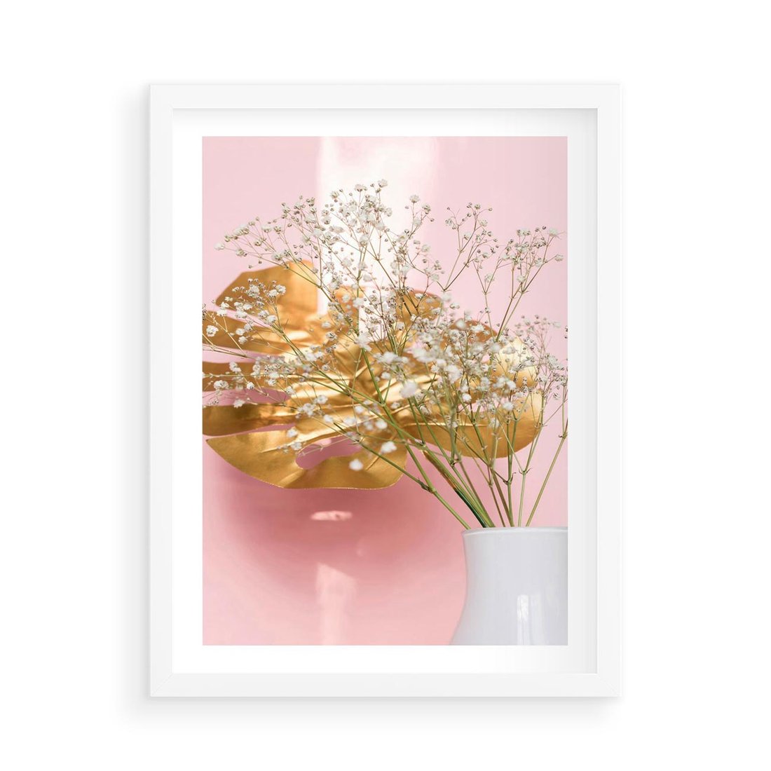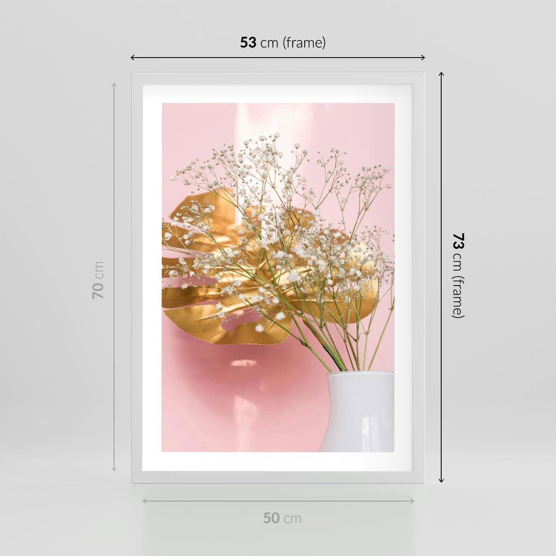 Plakat w ramie 50x70 - Złoty Akcent - złoty liść montery, gipsówka - rama biała