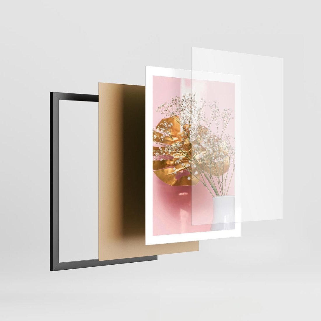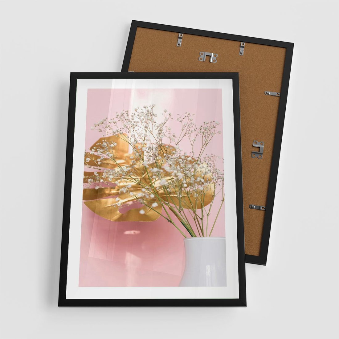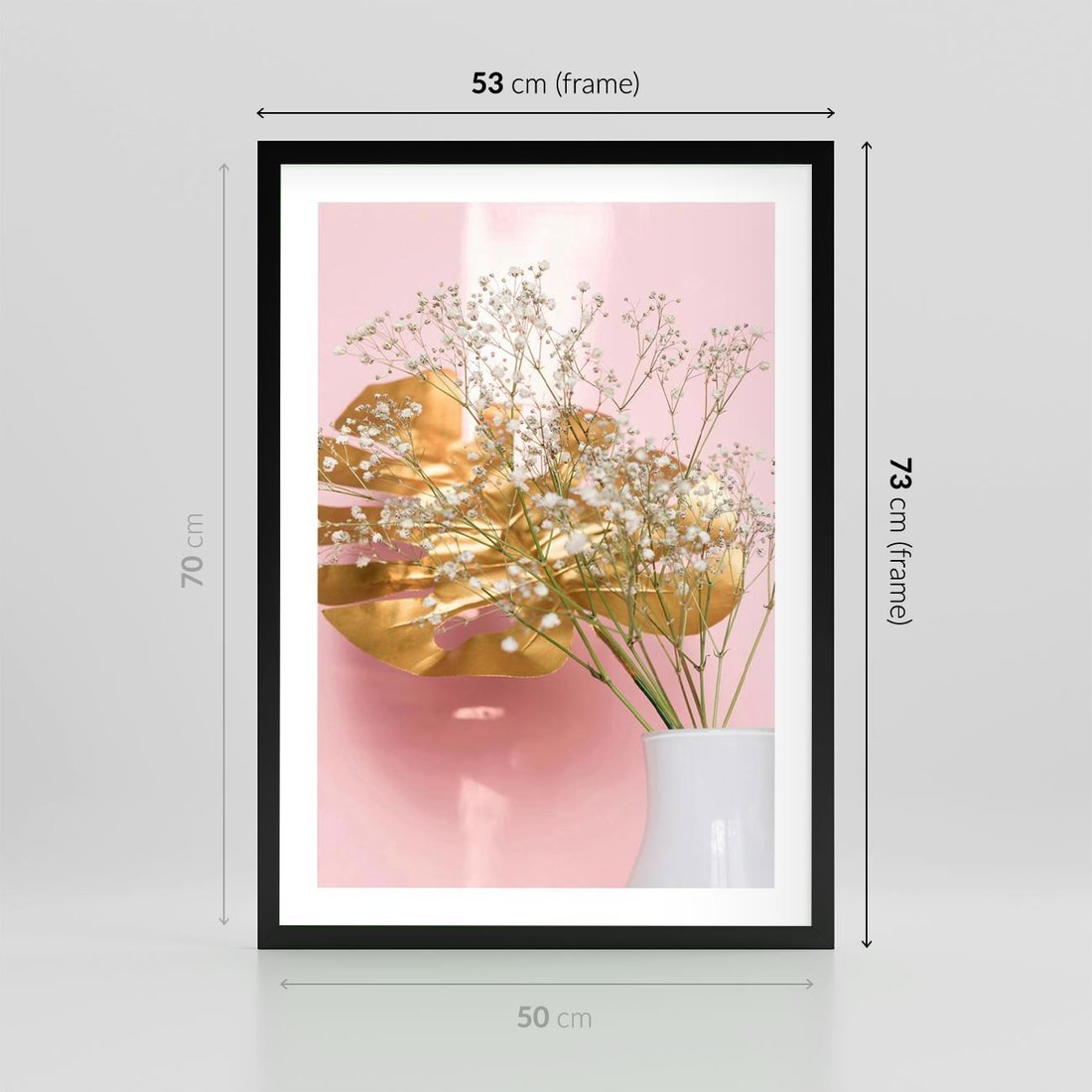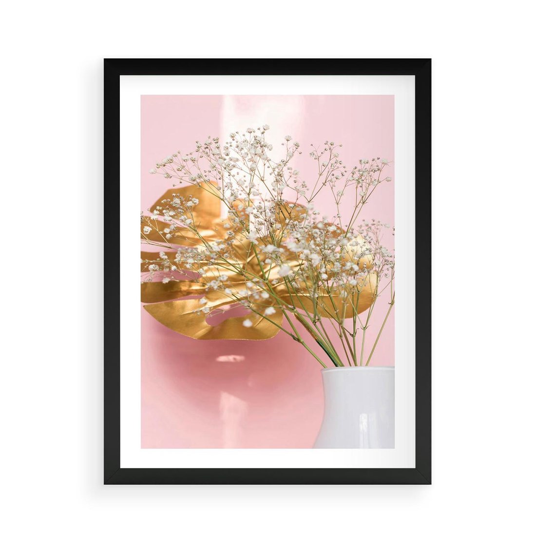 Plakat w ramie 50x70 - Złoty Akcent - złoty liść montery, gipsówka - rama czarna