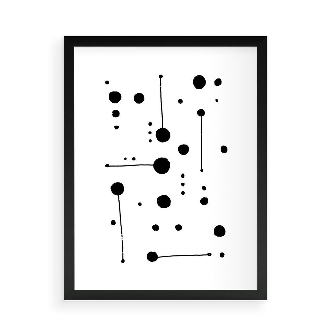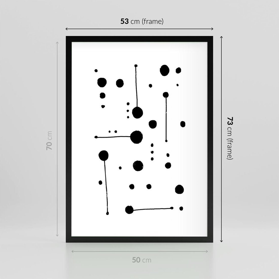 Nasz czarno-biały plakat to subtelne połączenie abstrakcji i minimalizmu, gdzie kropki i kreski tworzą misterną kompozycję. To delikatne wykorzystanie kontrastu, które zachwyca prostotą i elegancją. Ten plakat jest idealnym wyborem dla miłośników nowoczesnej sztuki, którzy cenią sobie wyrafinowany design i znaczeniowe detale.