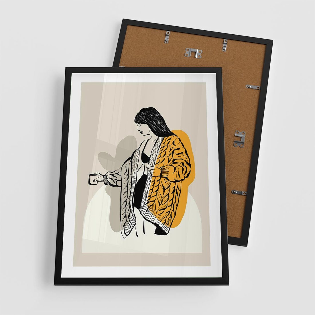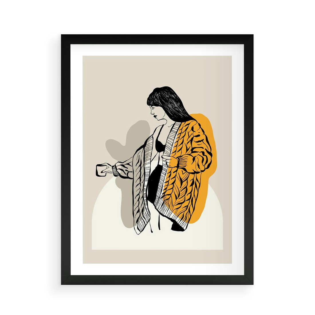 Obraz przedstawia minimalistyczną grafikę w formie szkicu kobiety, utrzymanego w czerni i bieli, z dodatkiem żółtych akcentów. Ta kompozycja doskonale podkreśla prostotę i elegancję, doskonale pasując do nowoczesnych wnętrz.