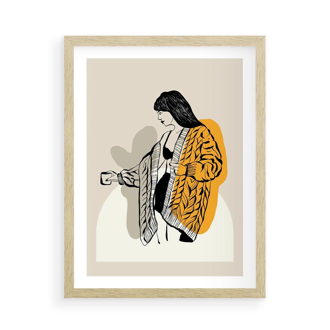 Obraz przedstawia minimalistyczną grafikę w formie szkicu kobiety, utrzymanego w czerni i bieli, z dodatkiem żółtych akcentów. Ta kompozycja doskonale podkreśla prostotę i elegancję, doskonale pasując do nowoczesnych wnętrz.