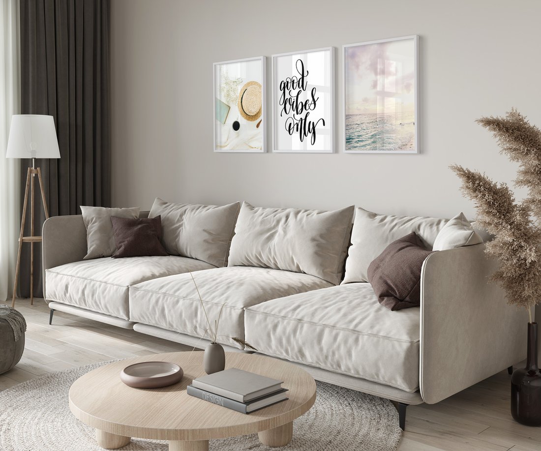 Zestaw obrazy w ramie 30x40 galeria - Good, vibes, plaża, boho, napis - rama biała