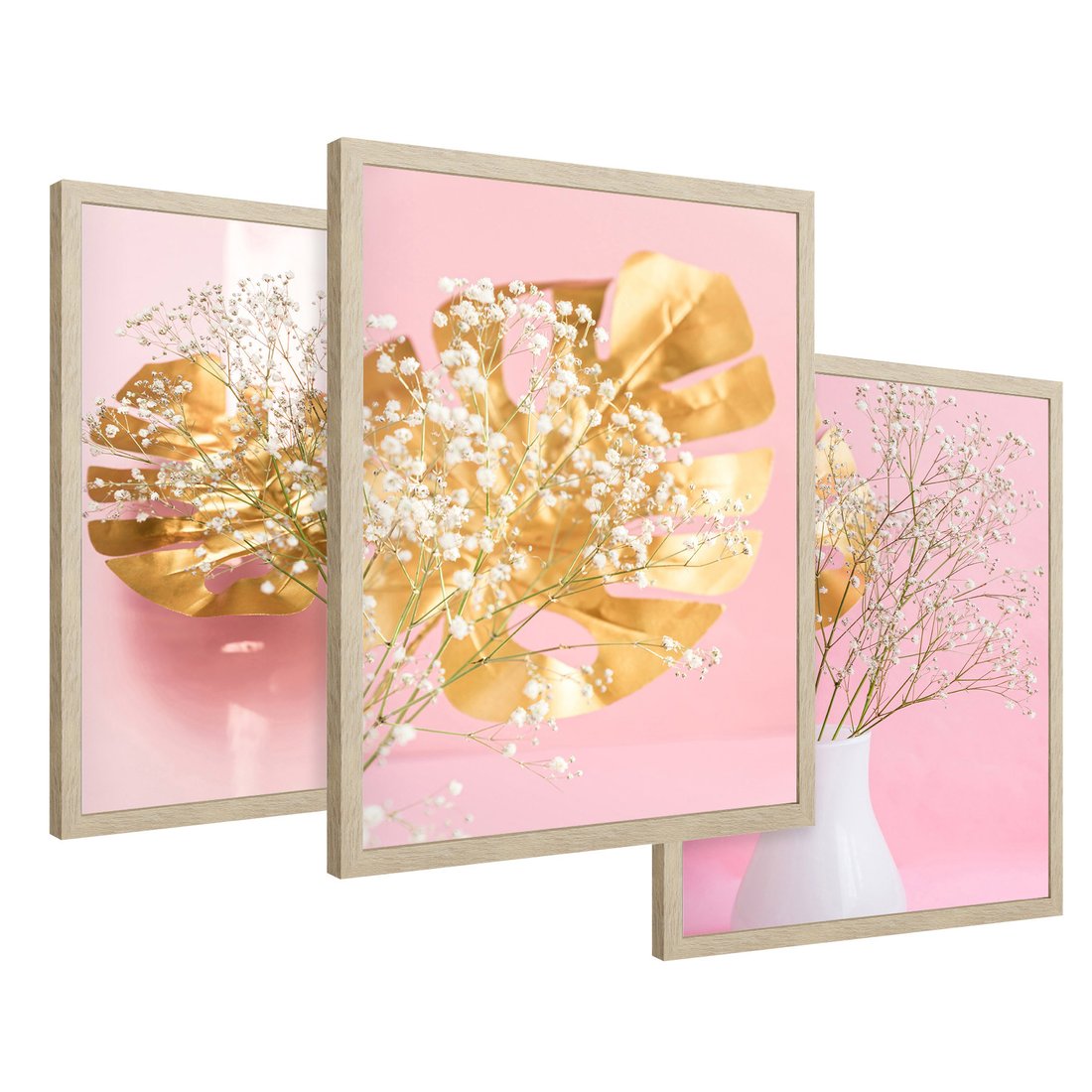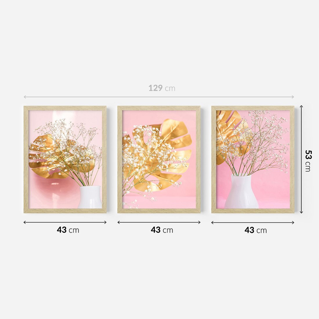 Zestaw obrazy w ramie 40x50 galeria - Złote, liście, monstera, kwiaty - rama drewno