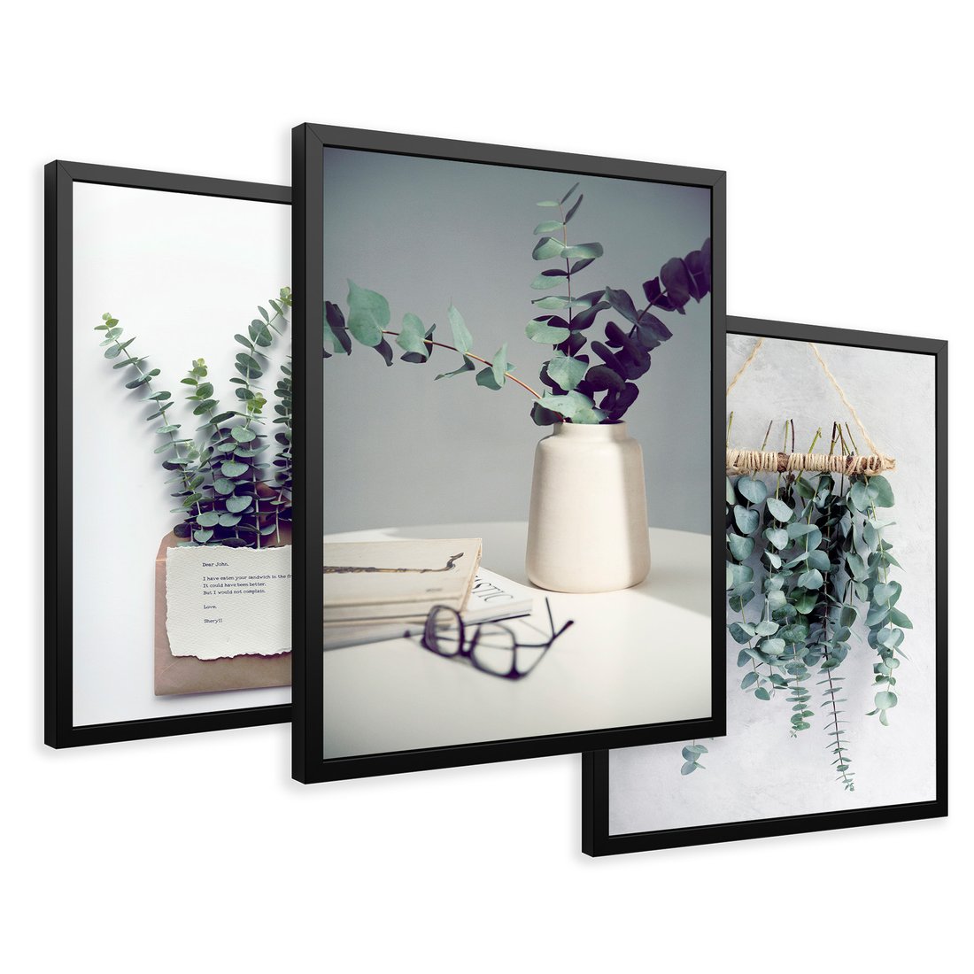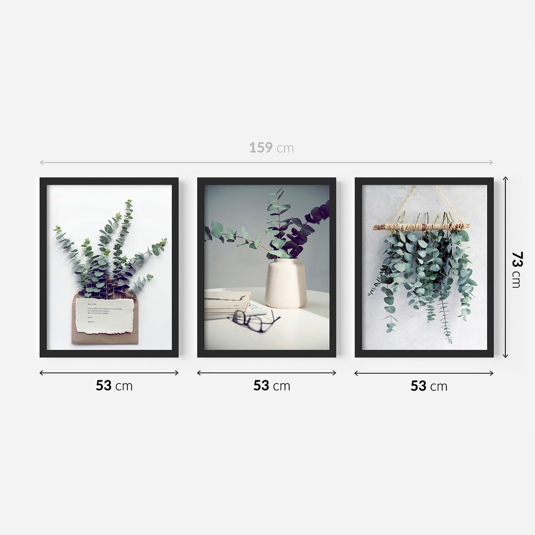 Zestaw obrazy w ramie 50x70 galeria - Eukaliptus, liście, tryptyk, skandynawski - rama czarna