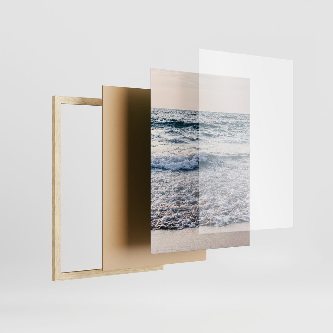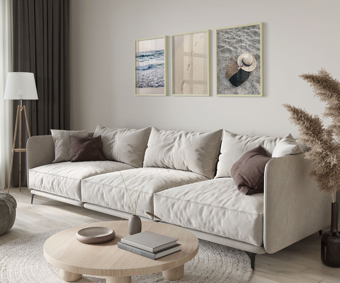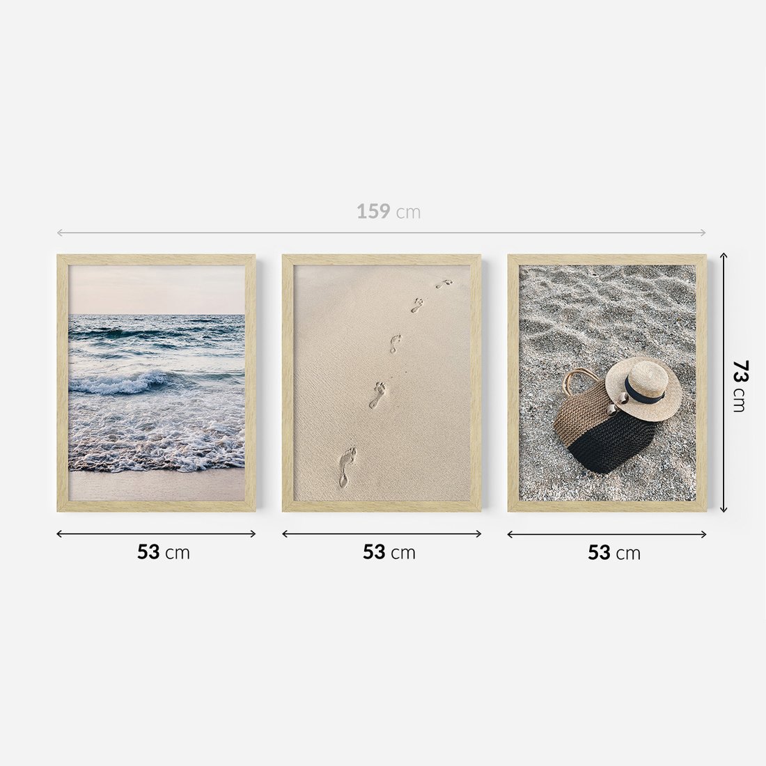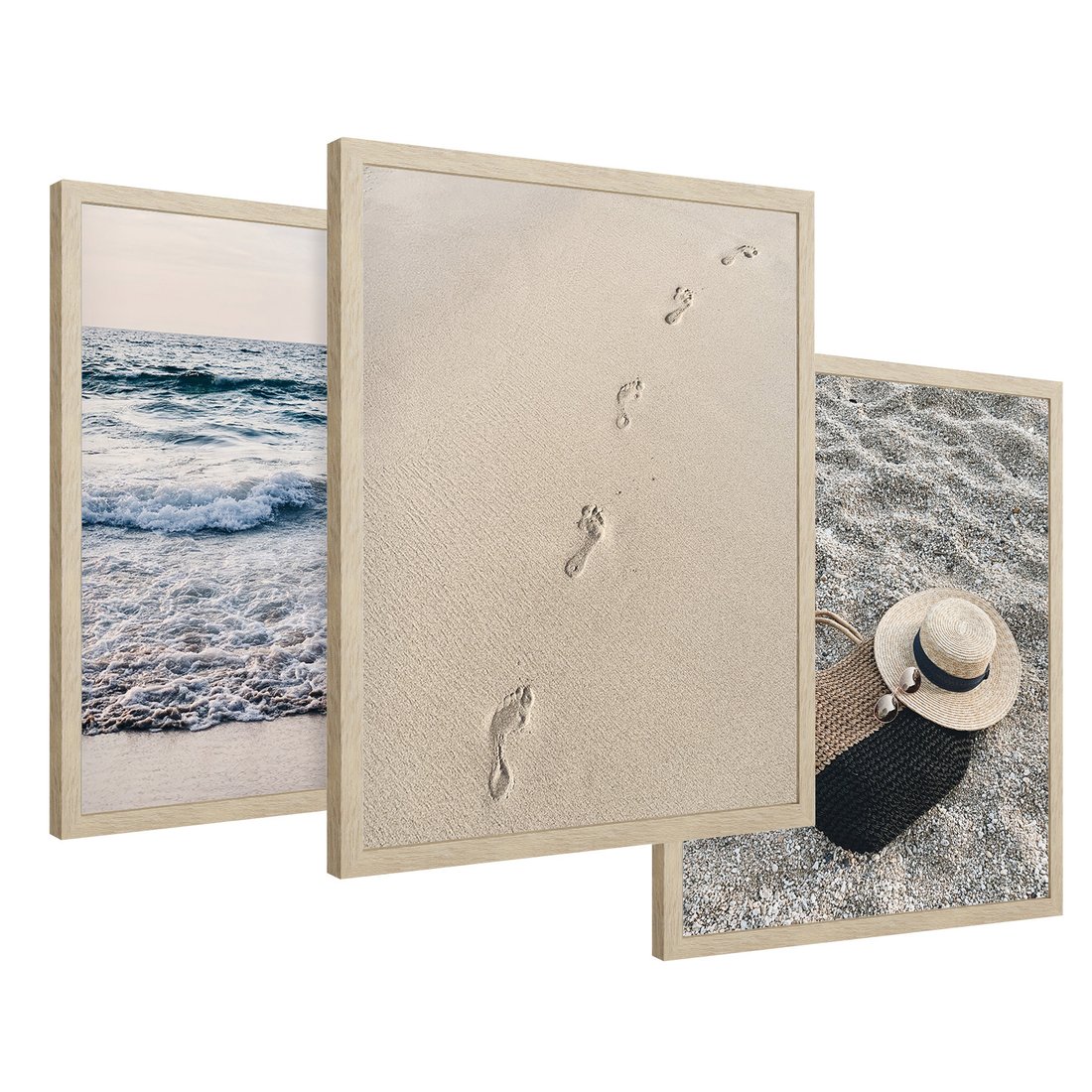 Zestaw obrazy w ramie 50x70 galeria - Plaża, piasek, ślady, kapelusz - rama drewno