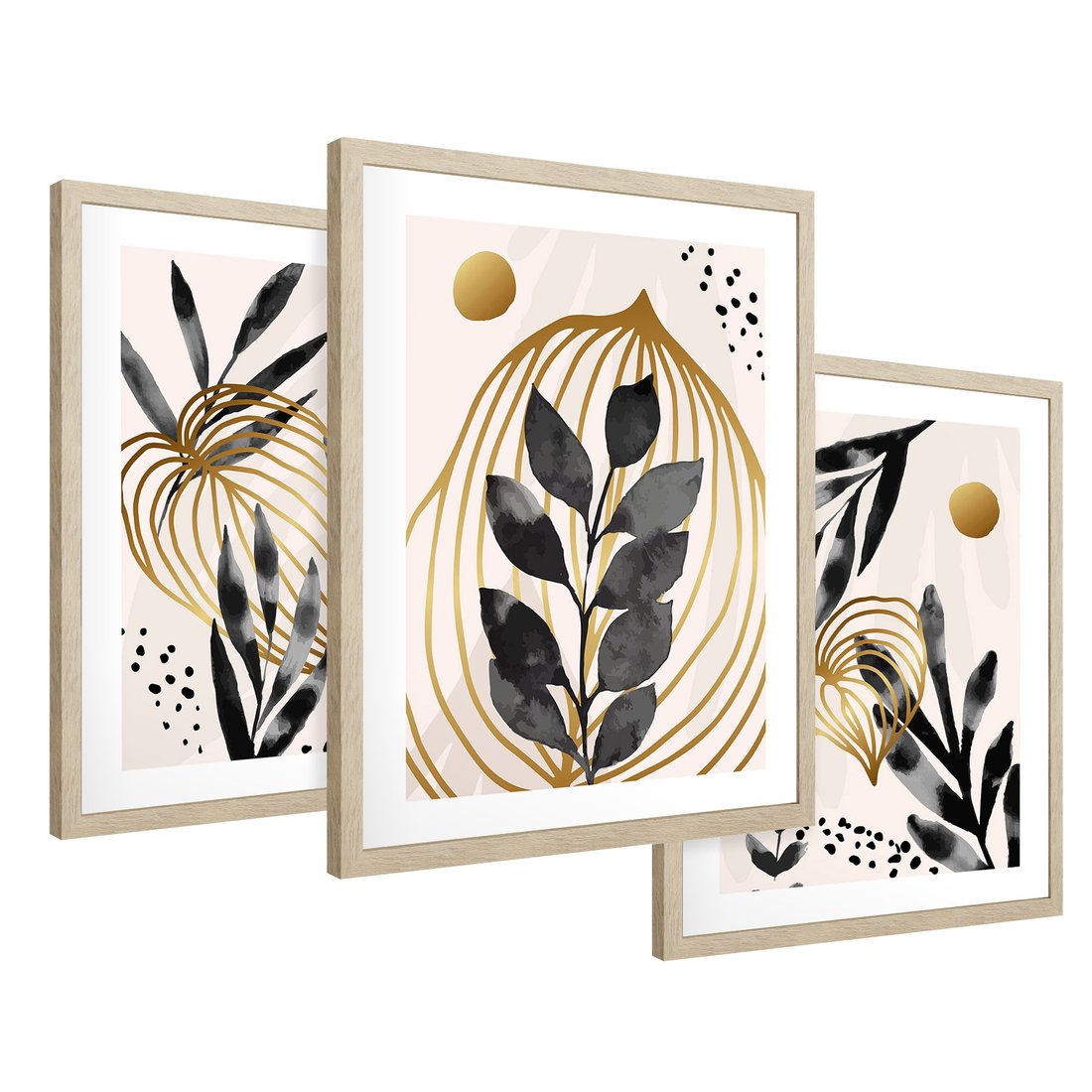 Zestaw obrazy w ramie 50x70 galeria - Złoto, liście, akwarele - rama drewno